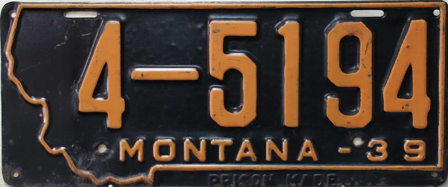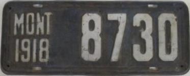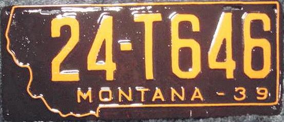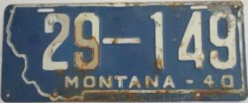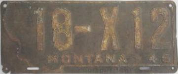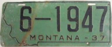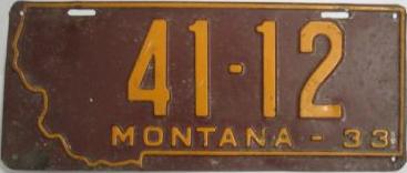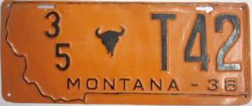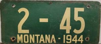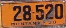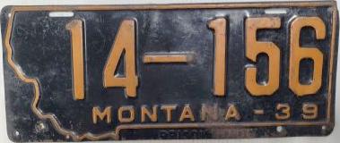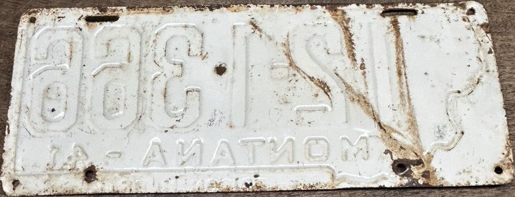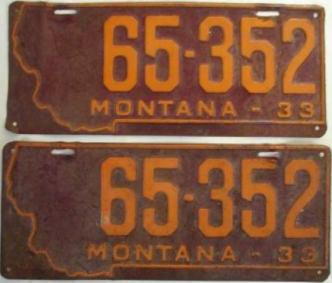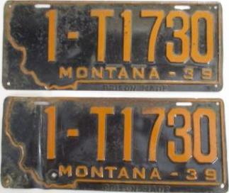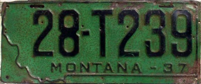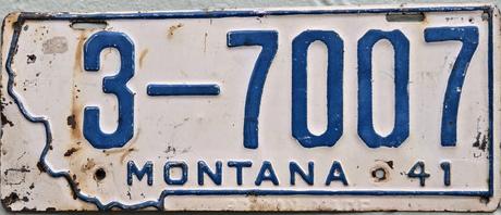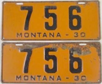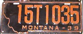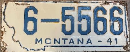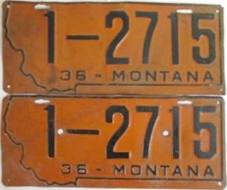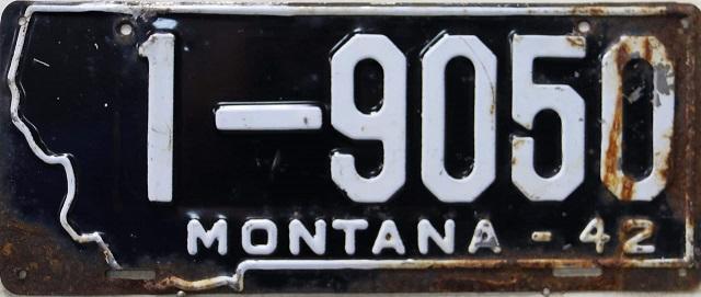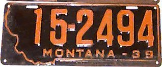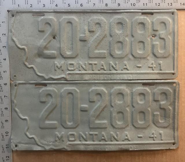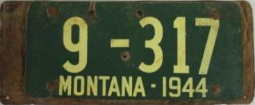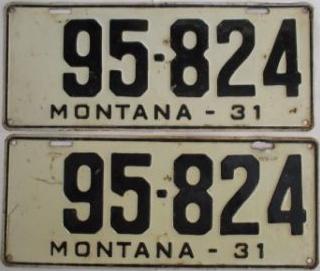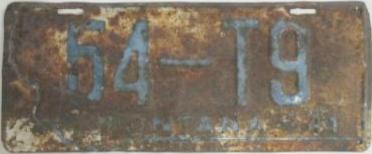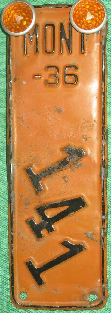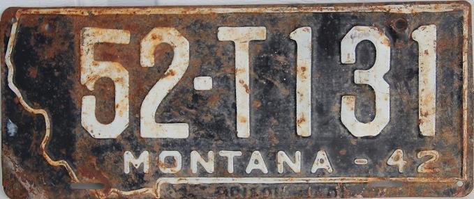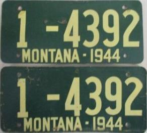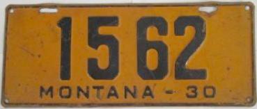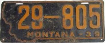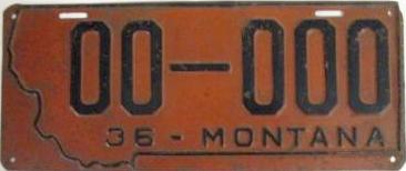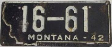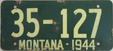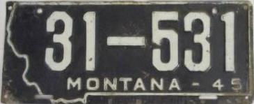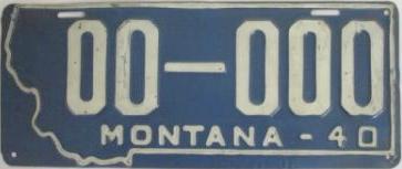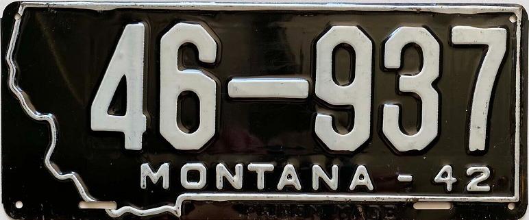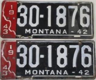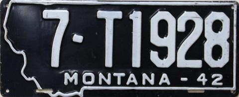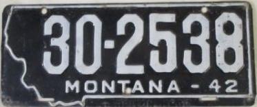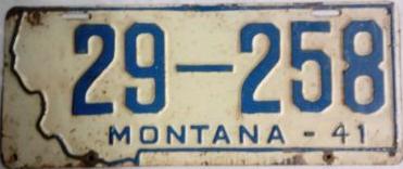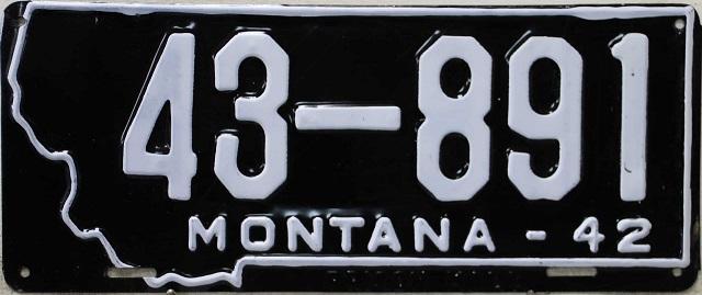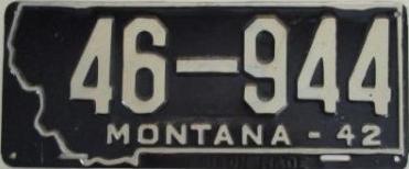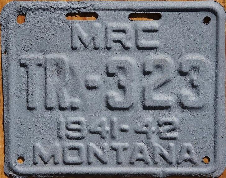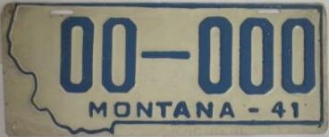 | 1941, старший известный номер мотоциклов - 129. легковые автомобили - 1-9003, 2-124, 2-4458, 3-7007, 4-325, 4-2691, 6-5566, 12-1366, 20-2883, 29-258, 43-857, обратная сторона. грузовики - 15-T110 (перекрас), 21-T727, 54-T9, обратная сторона. образец знака для отделений дорожной полиции - 00-000. дополнительный знак прицепа Монтанской железнодорожной комиссии, 1941-1942 - MRC Tr.-323, обратная сторона, был с чёрными буквами на жёлтом фоне.  |