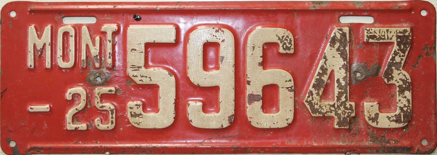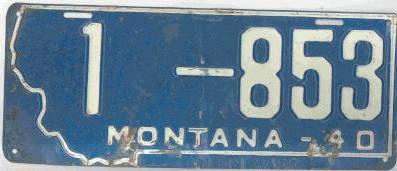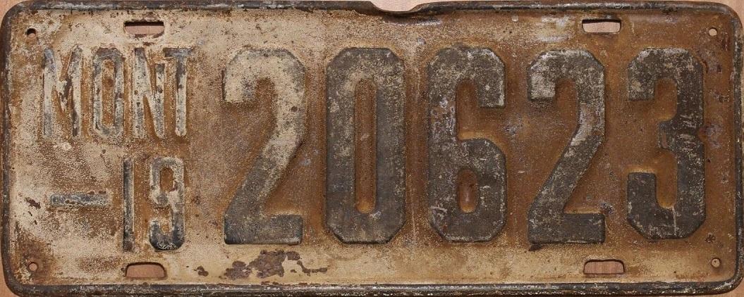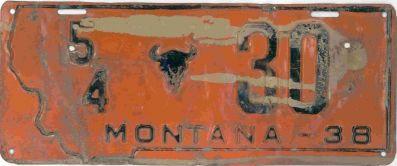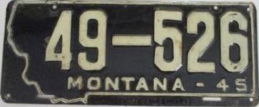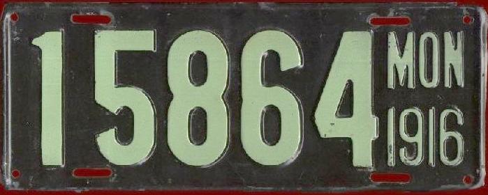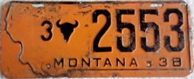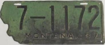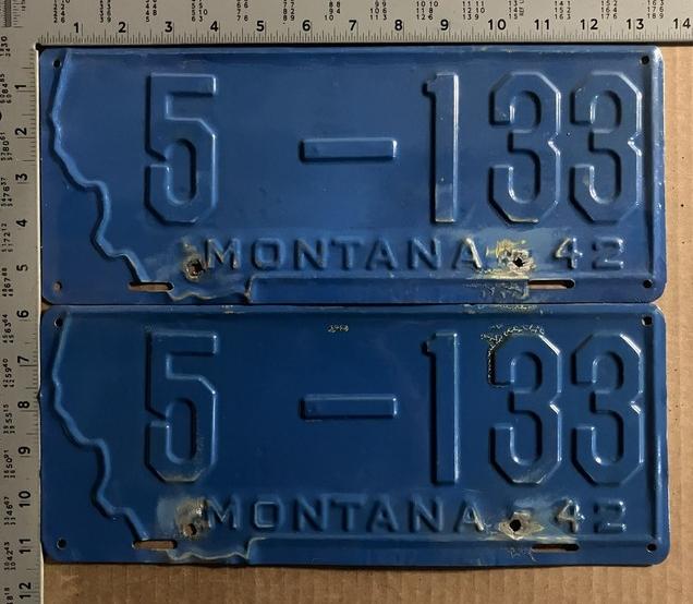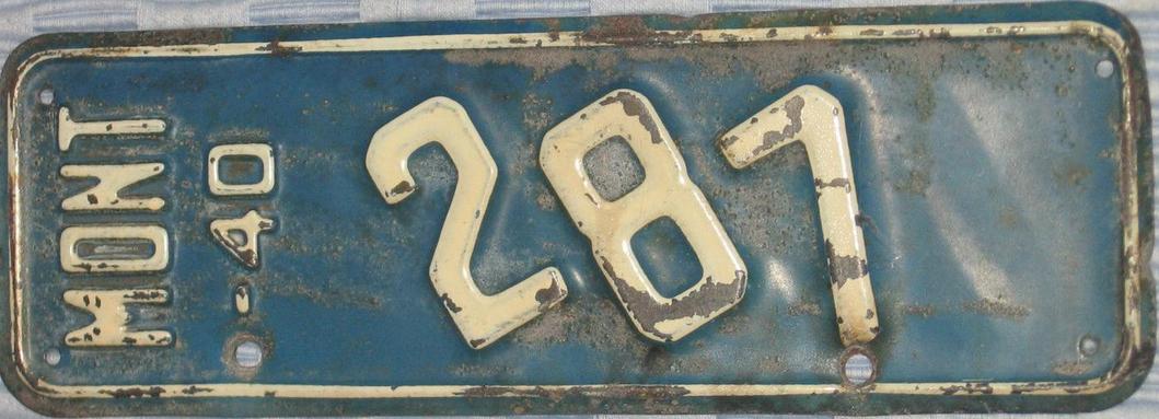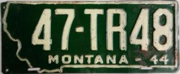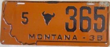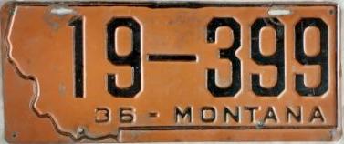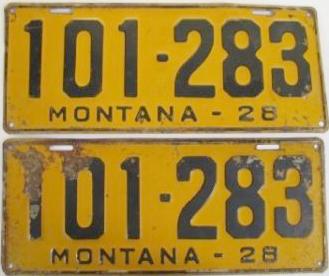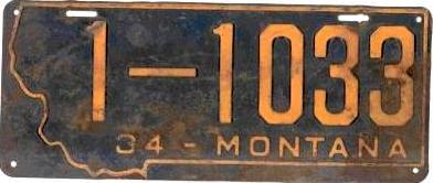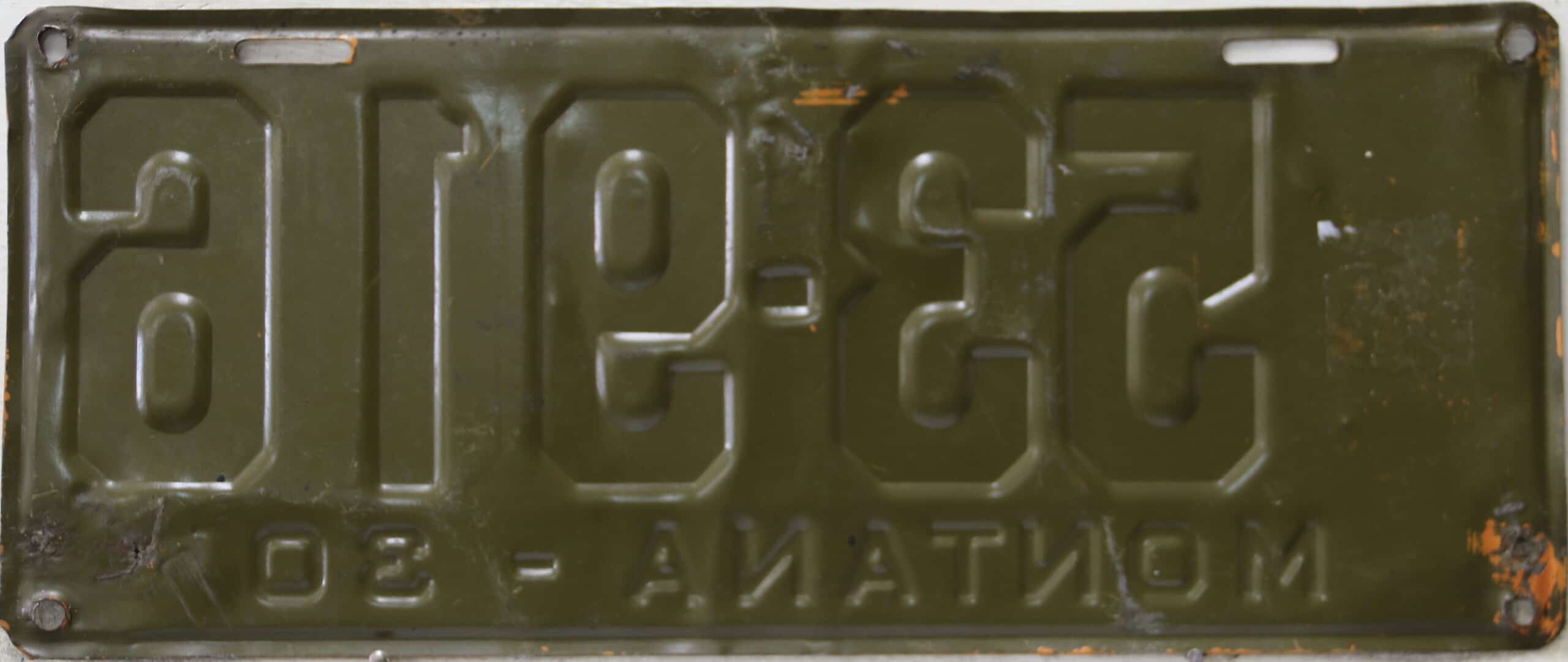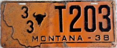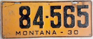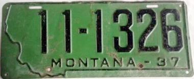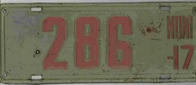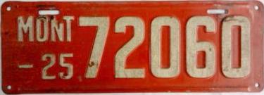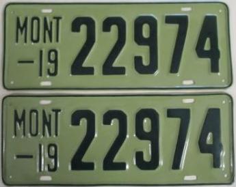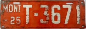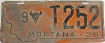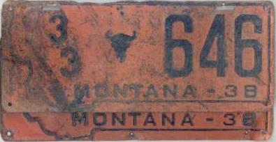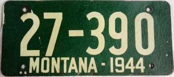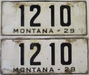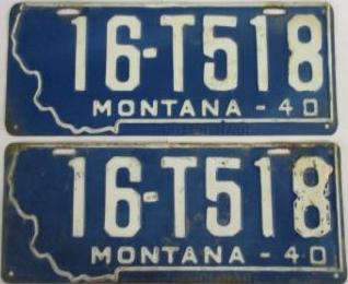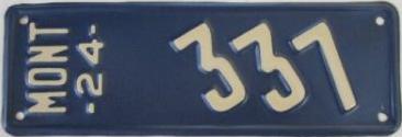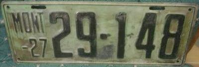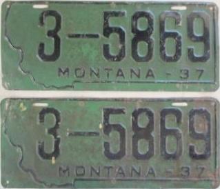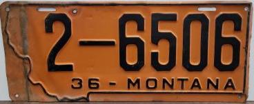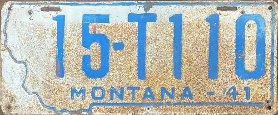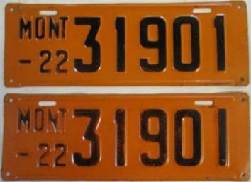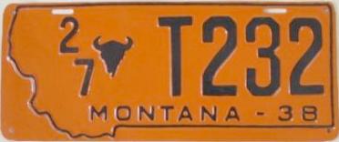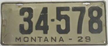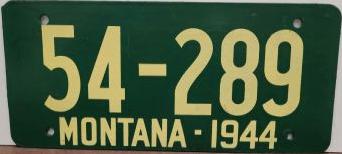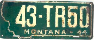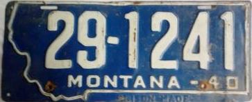 | 1941, старший известный номер мотоциклов - 129. легковые автомобили - 1-9003, 2-124, 2-4458, 3-7007, 4-325, 4-2691, 6-5566, 12-1366, 20-2883, 29-258, 43-857, обратная сторона. грузовики - 15-T110 (перекрас), 21-T727, 54-T9, обратная сторона. образец знака для отделений дорожной полиции - 00-000. дополнительный знак прицепа Монтанской железнодорожной комиссии, 1941-1942 - MRC Tr.-323, обратная сторона, был с чёрными буквами на жёлтом фоне.  |