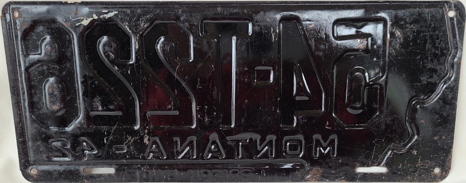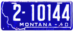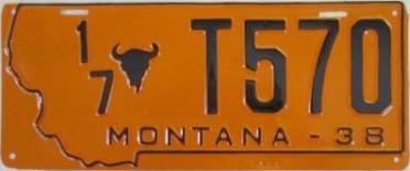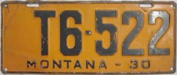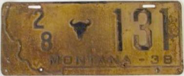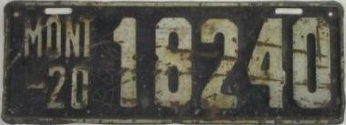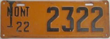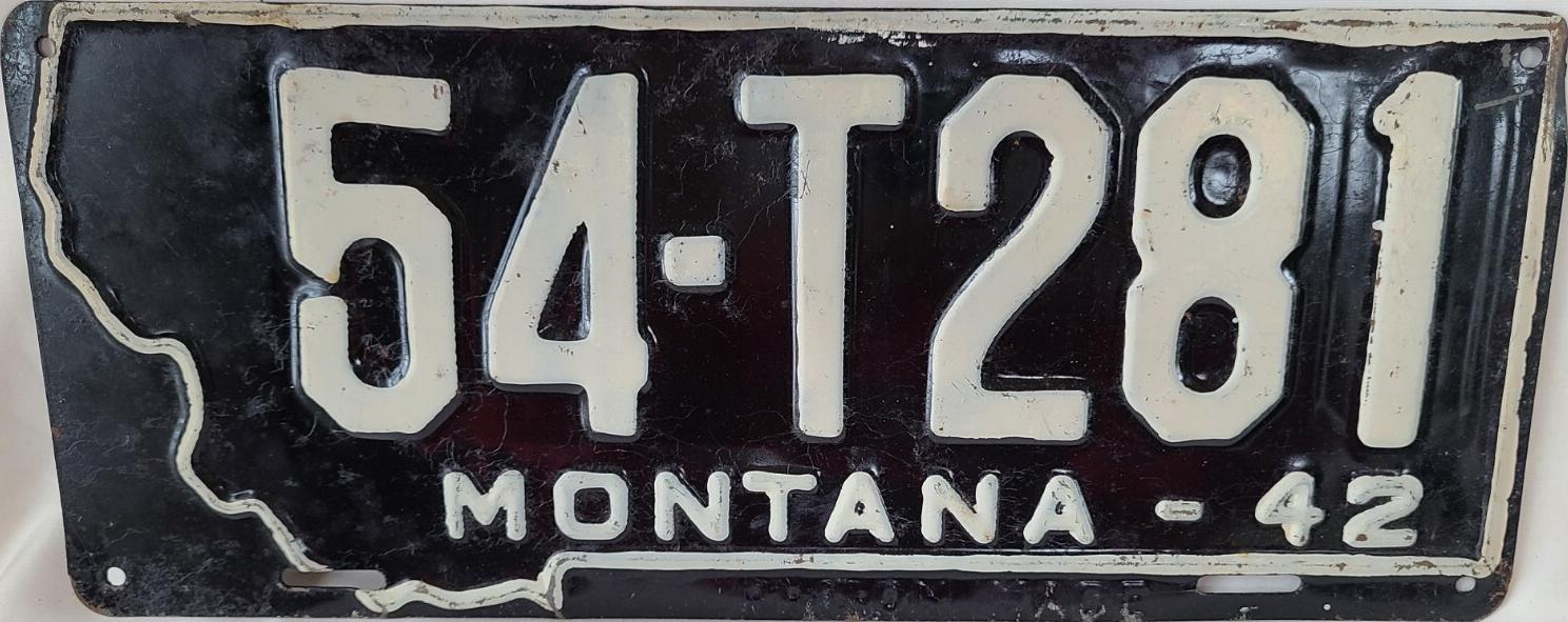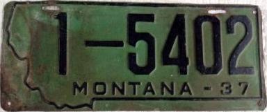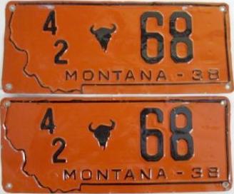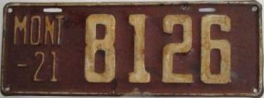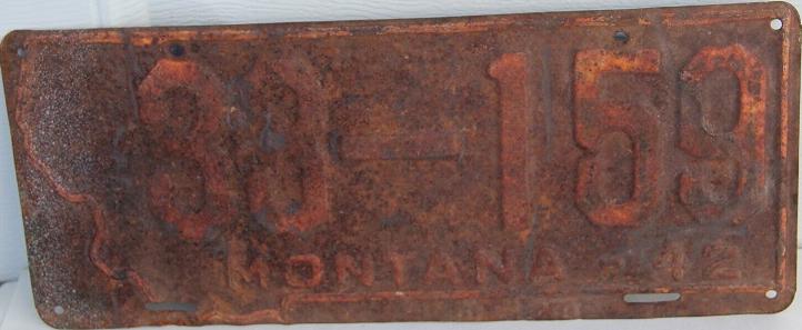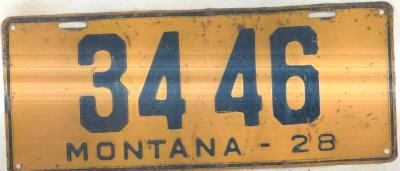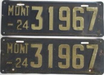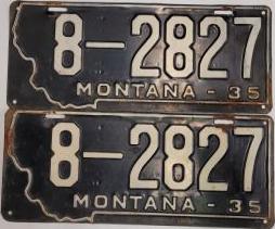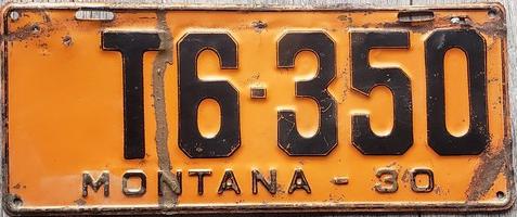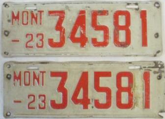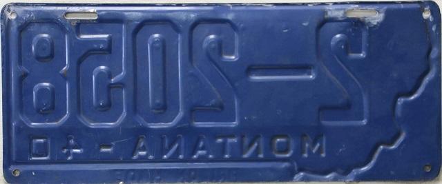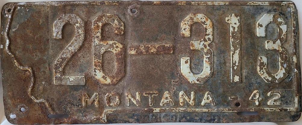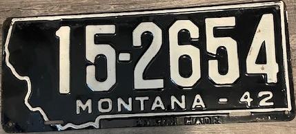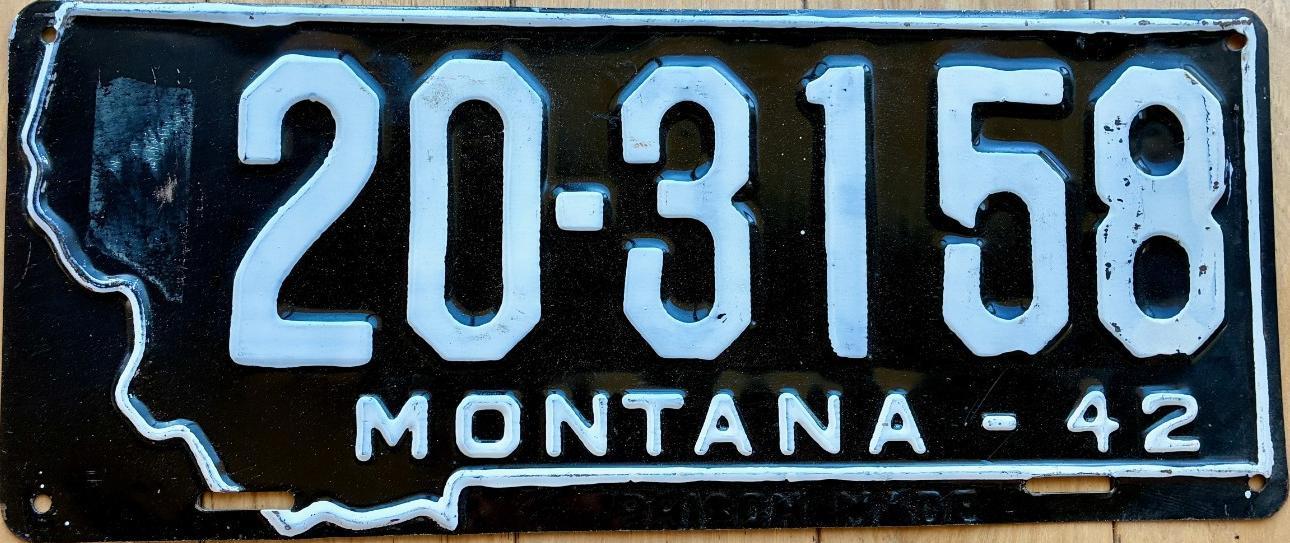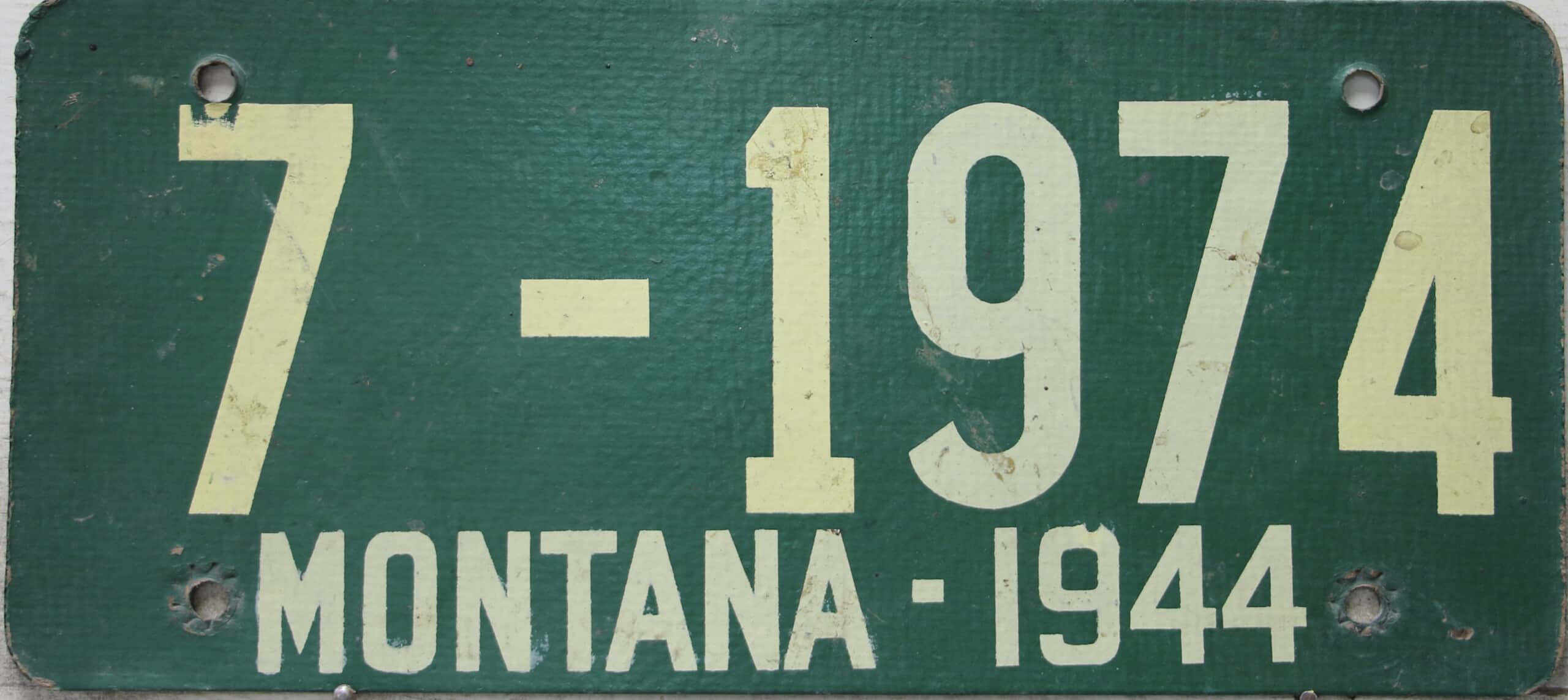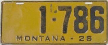 | 1941, старший известный номер мотоциклов - 129. легковые автомобили - 1-9003, 2-124, 2-4458, 3-7007, 4-325, 4-2691, 6-5566, 12-1366, 20-2883, 29-258, 43-857, обратная сторона. грузовики - 15-T110 (перекрас), 21-T727, 54-T9, обратная сторона. образец знака для отделений дорожной полиции - 00-000. дополнительный знак прицепа Монтанской железнодорожной комиссии, 1941-1942 - MRC Tr.-323, обратная сторона, был с чёрными буквами на жёлтом фоне.  |