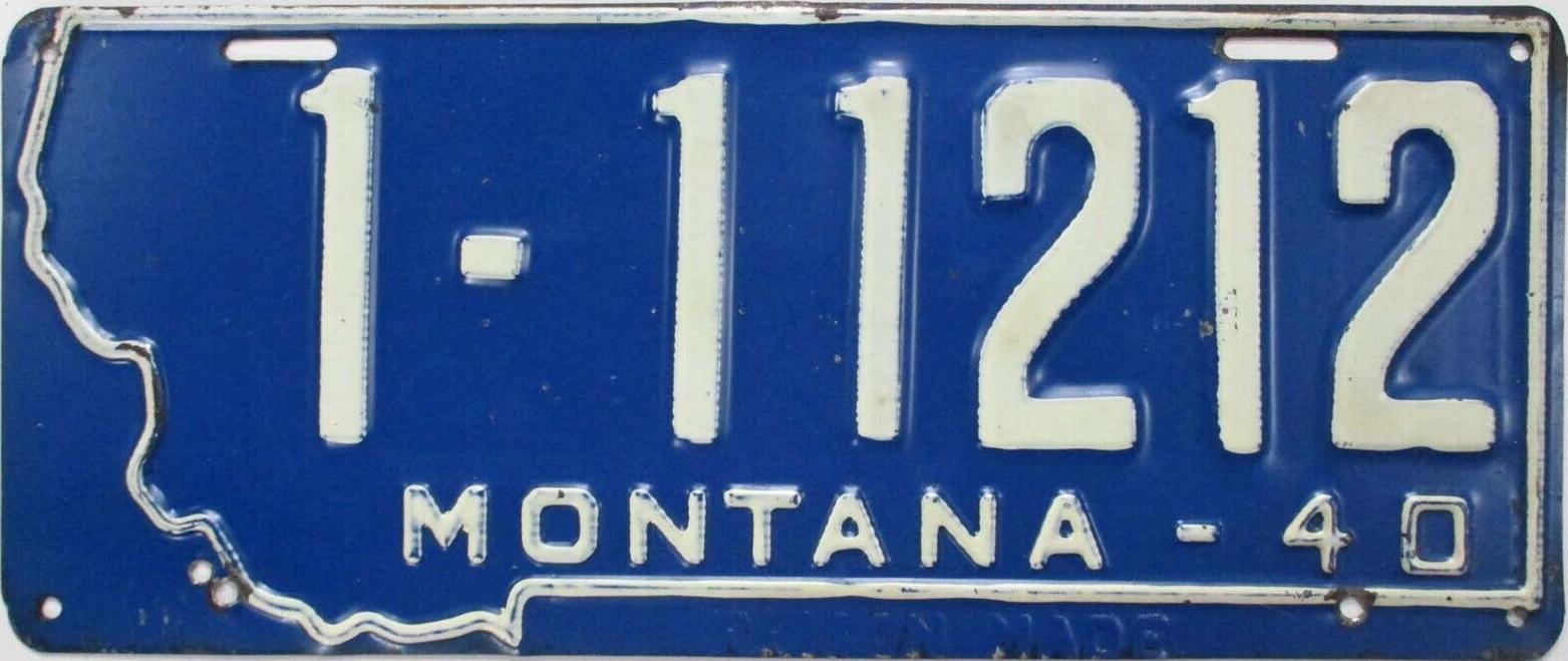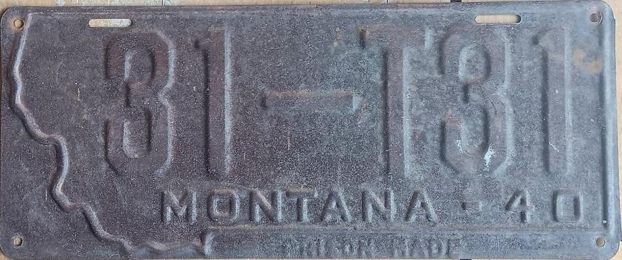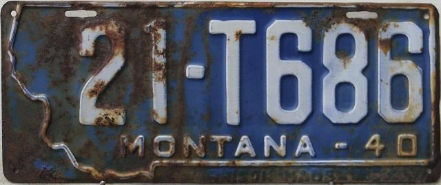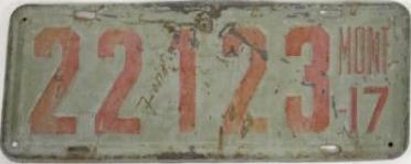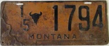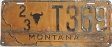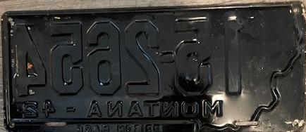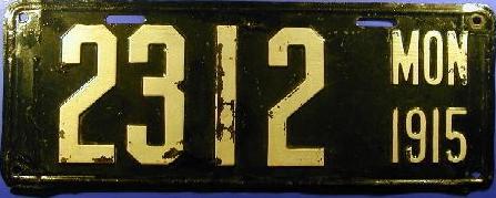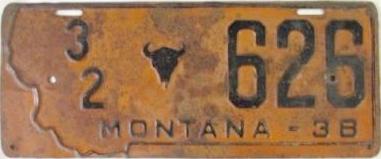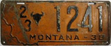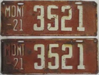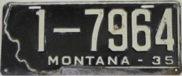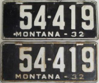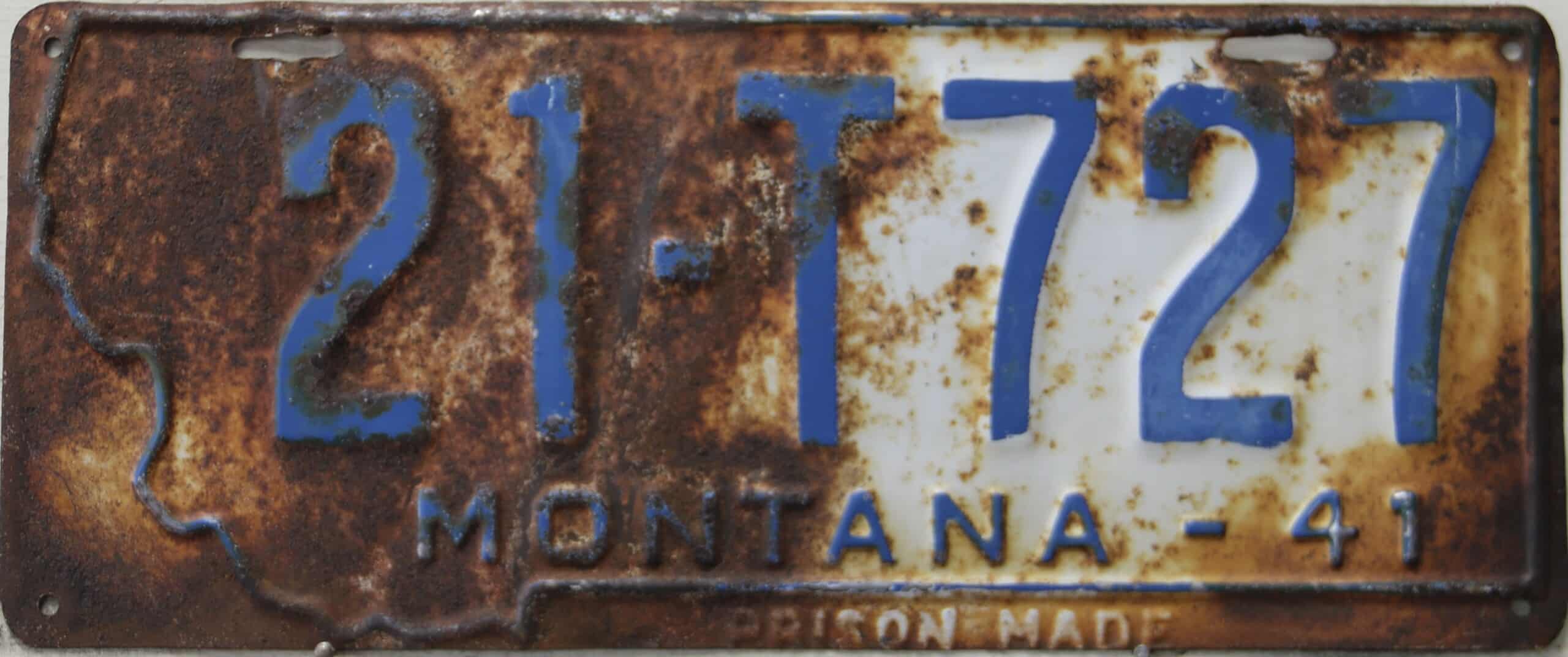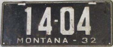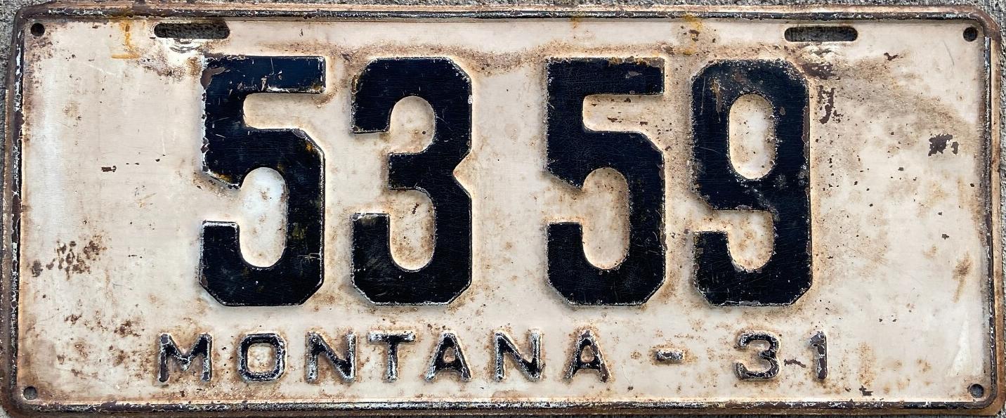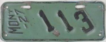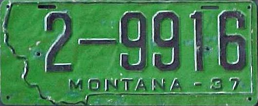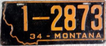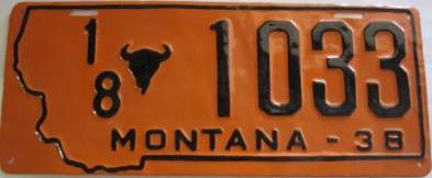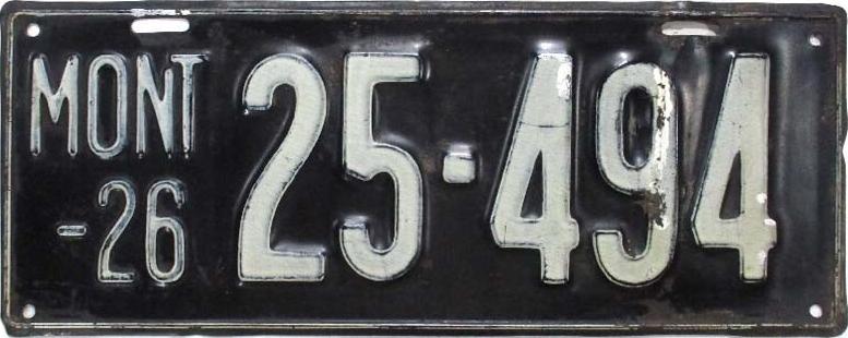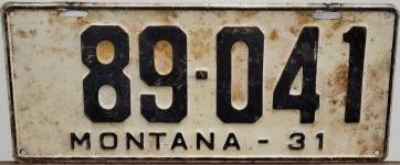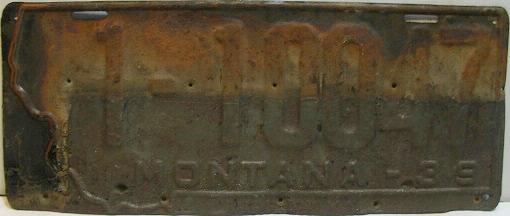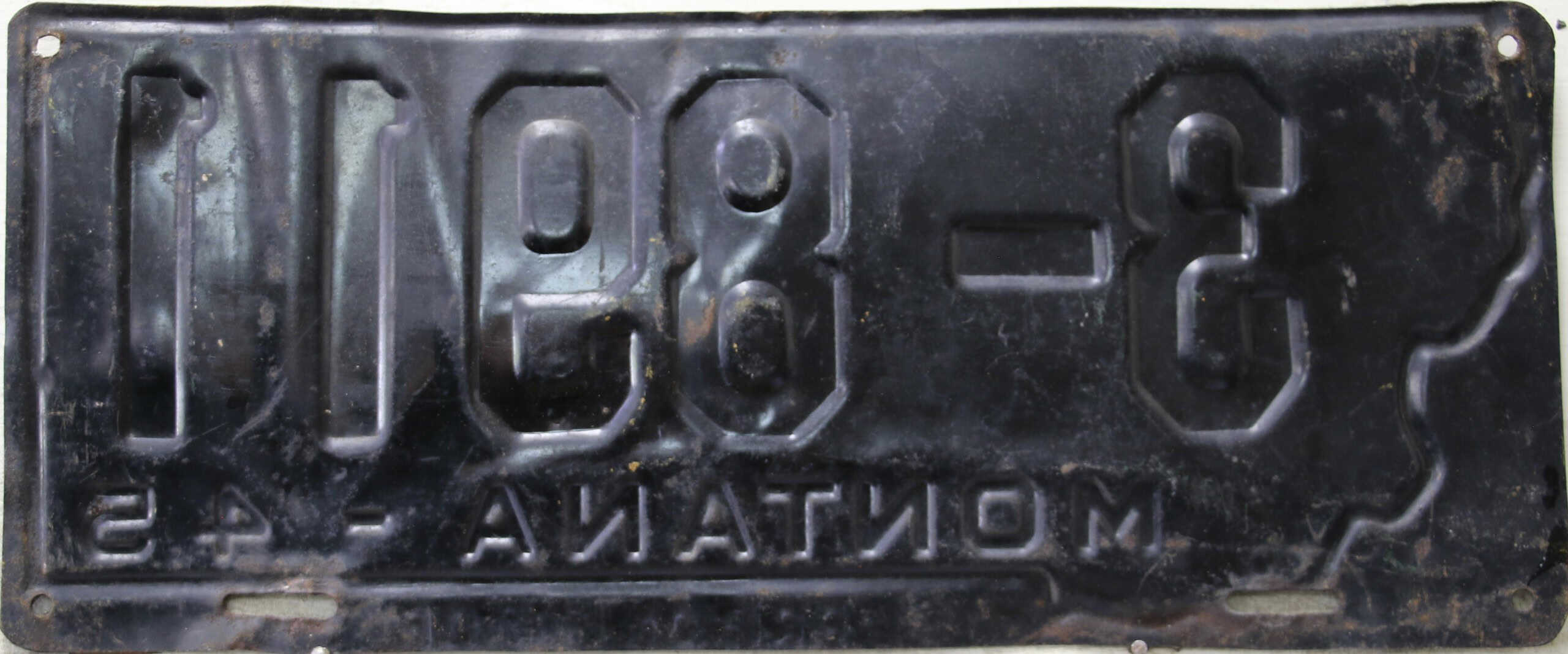 | 1941, старший известный номер мотоциклов - 129. легковые автомобили - 1-9003, 2-124, 2-4458, 3-7007, 4-325, 4-2691, 6-5566, 12-1366, 20-2883, 29-258, 43-857, обратная сторона. грузовики - 15-T110 (перекрас), 21-T727, 54-T9, обратная сторона. образец знака для отделений дорожной полиции - 00-000. дополнительный знак прицепа Монтанской железнодорожной комиссии, 1941-1942 - MRC Tr.-323, обратная сторона, был с чёрными буквами на жёлтом фоне.  |