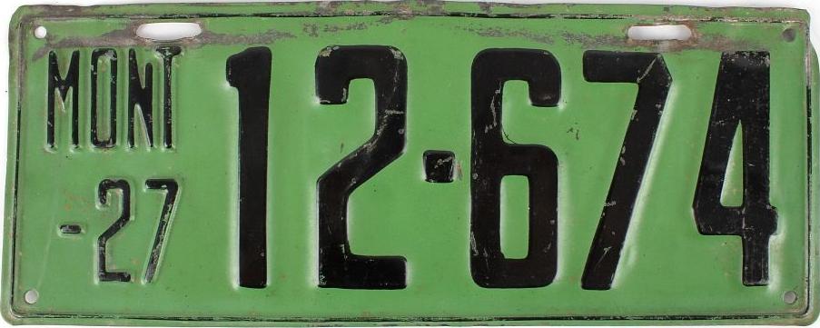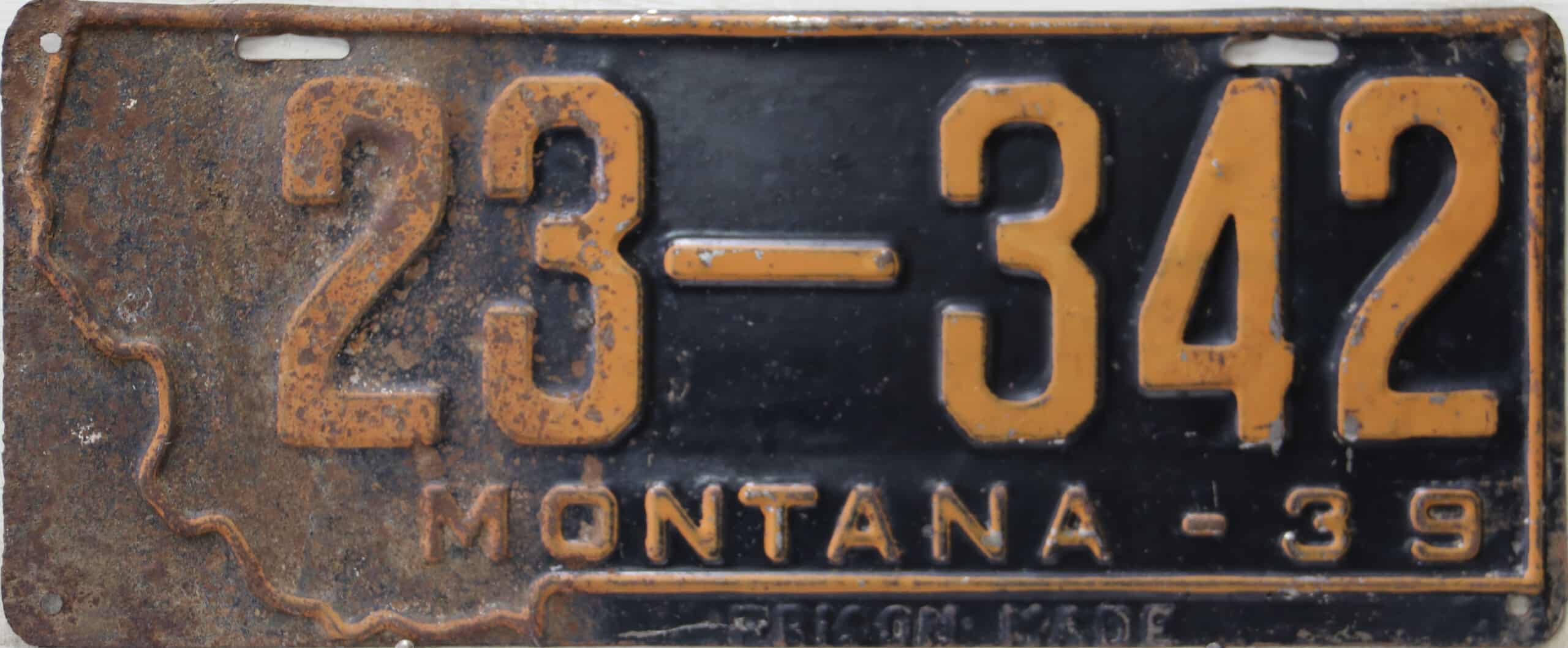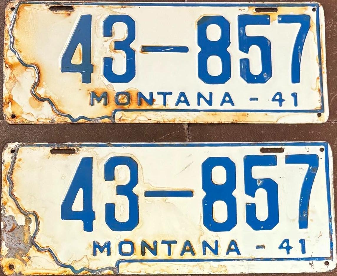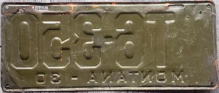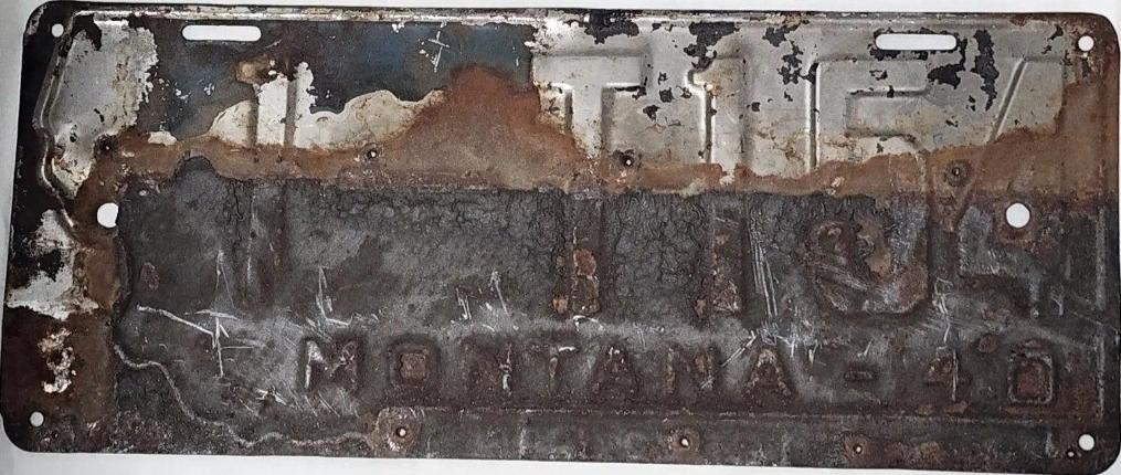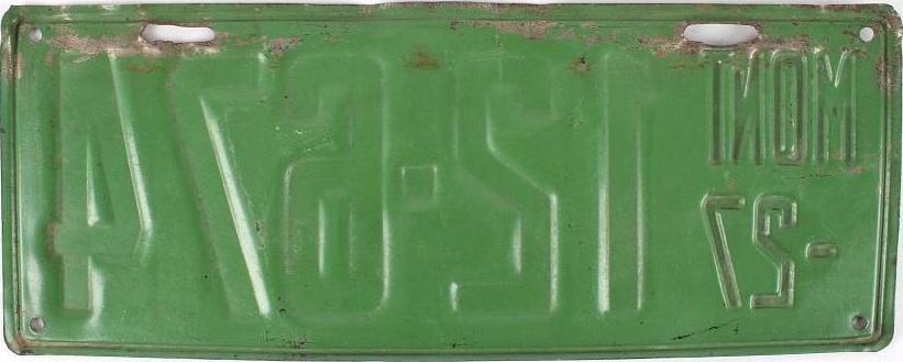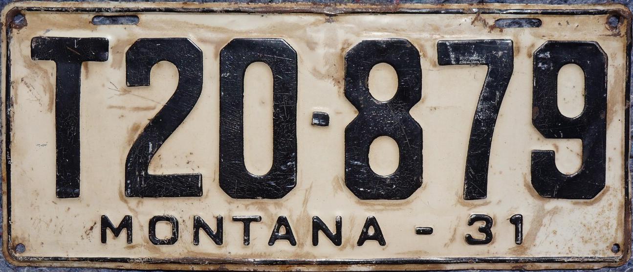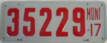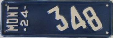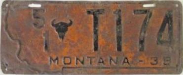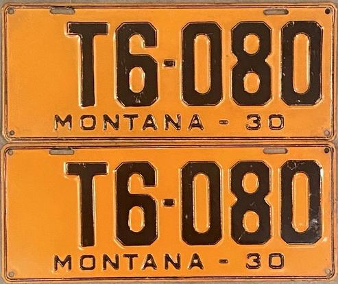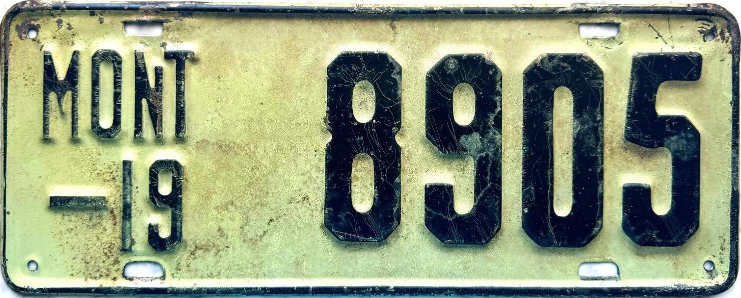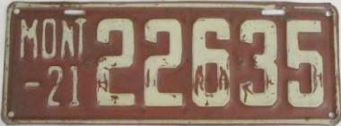 | 1941, старший известный номер мотоциклов - 129. легковые автомобили - 1-9003, 2-124, 2-4458, 3-7007, 4-325, 4-2691, 6-5566, 12-1366, 20-2883, 29-258, 43-857, обратная сторона. грузовики - 15-T110 (перекрас), 21-T727, 54-T9, обратная сторона. образец знака для отделений дорожной полиции - 00-000. дополнительный знак прицепа Монтанской железнодорожной комиссии, 1941-1942 - MRC Tr.-323, обратная сторона, был с чёрными буквами на жёлтом фоне.  |