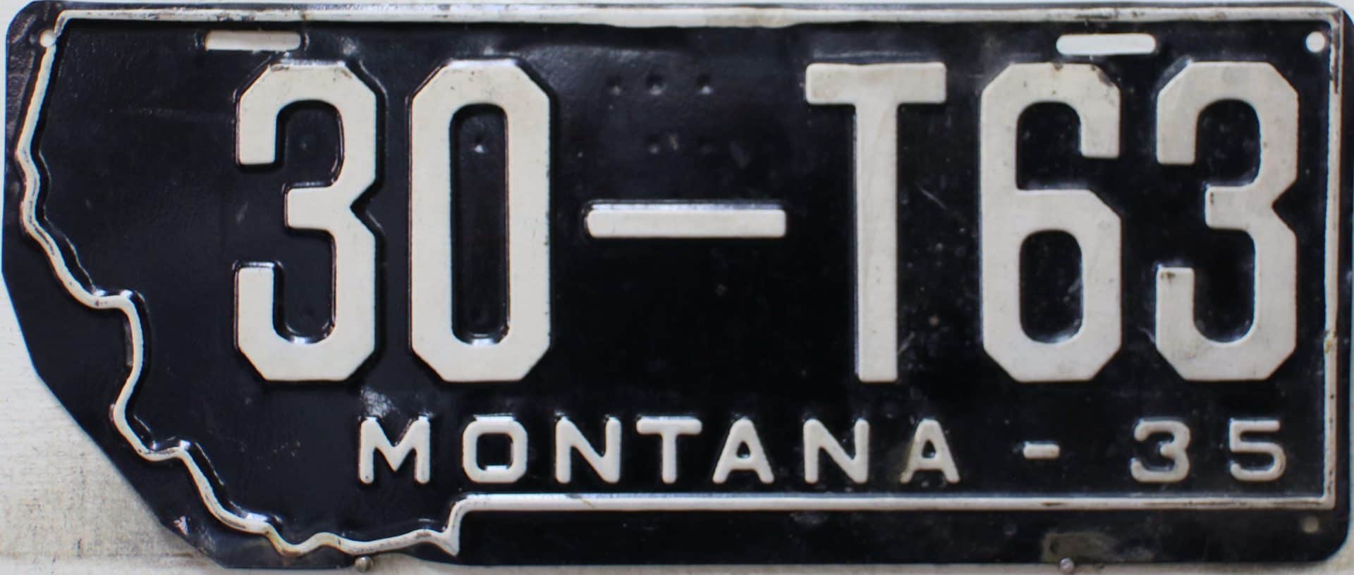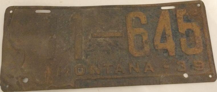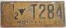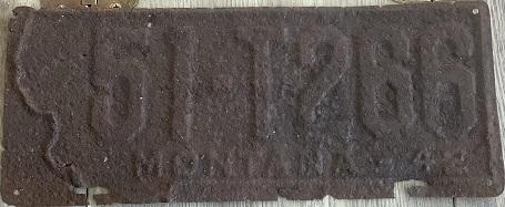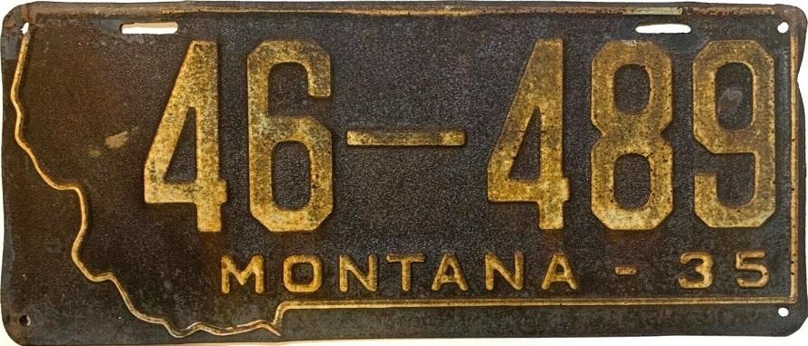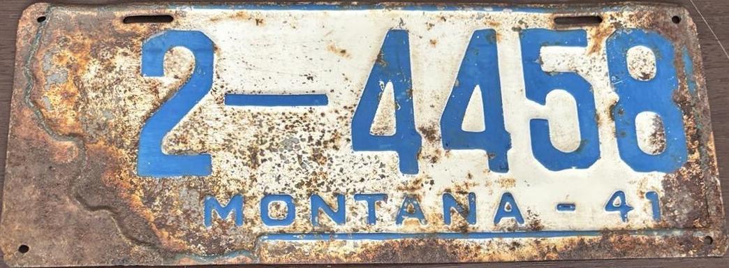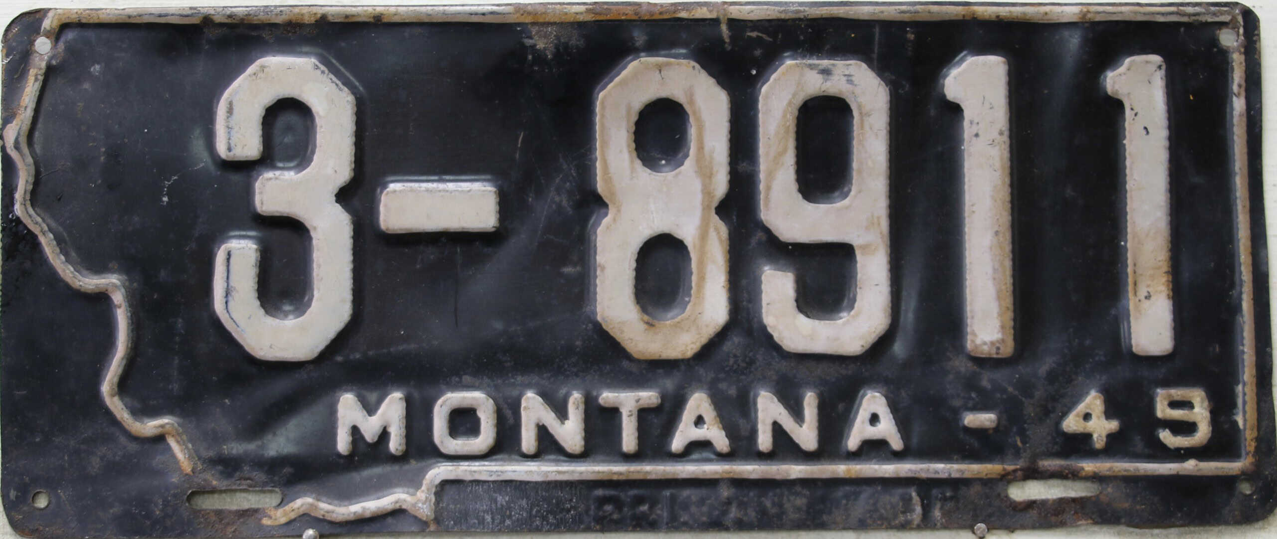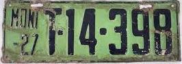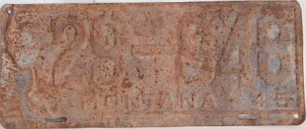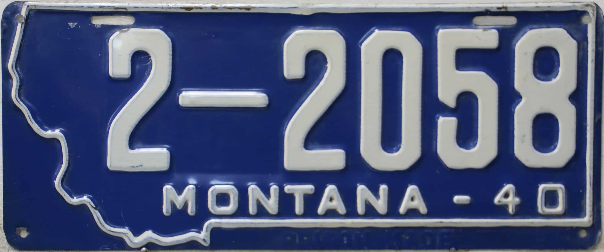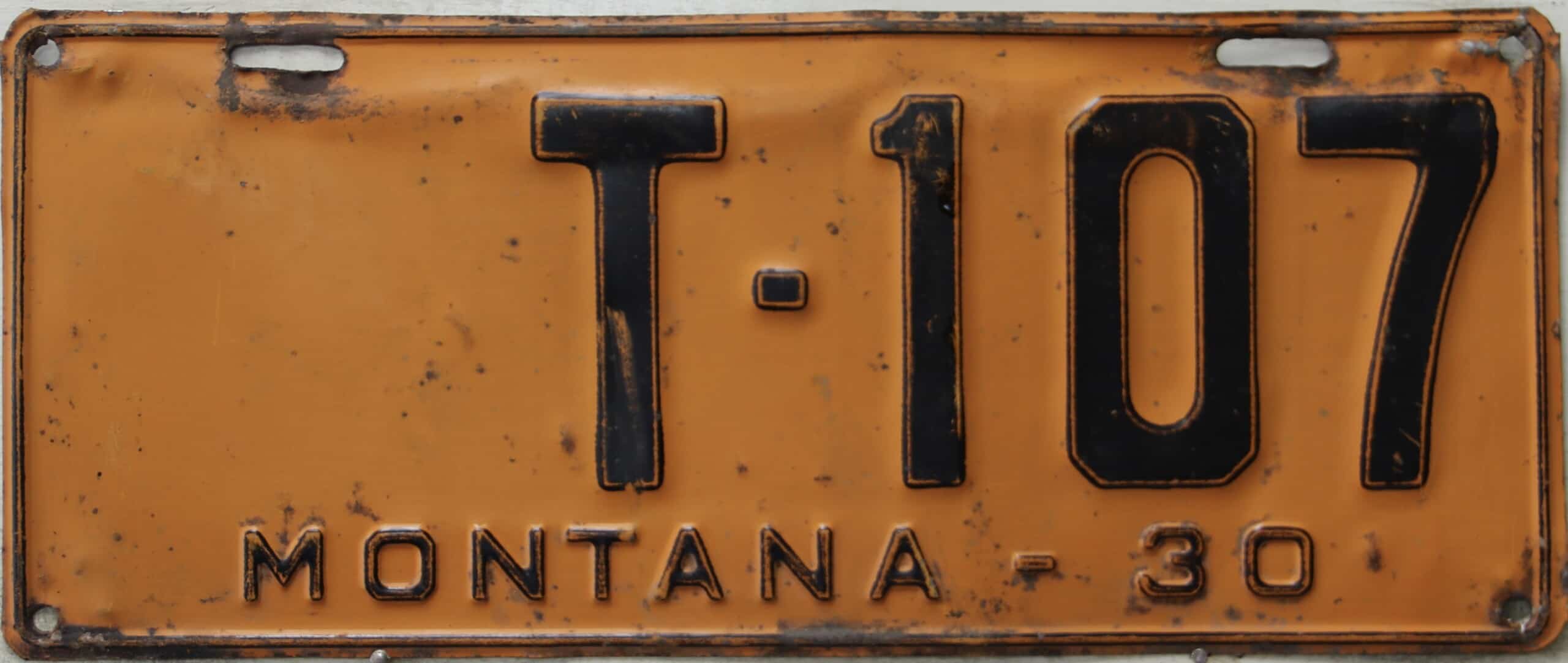 | 1941, старший известный номер мотоциклов - 129. легковые автомобили - 1-9003, 2-124, 2-4458, 3-7007, 4-325, 4-2691, 6-5566, 12-1366, 20-2883, 29-258, 43-857, обратная сторона. грузовики - 15-T110 (перекрас), 21-T727, 54-T9, обратная сторона. образец знака для отделений дорожной полиции - 00-000. дополнительный знак прицепа Монтанской железнодорожной комиссии, 1941-1942 - MRC Tr.-323, обратная сторона, был с чёрными буквами на жёлтом фоне.  |