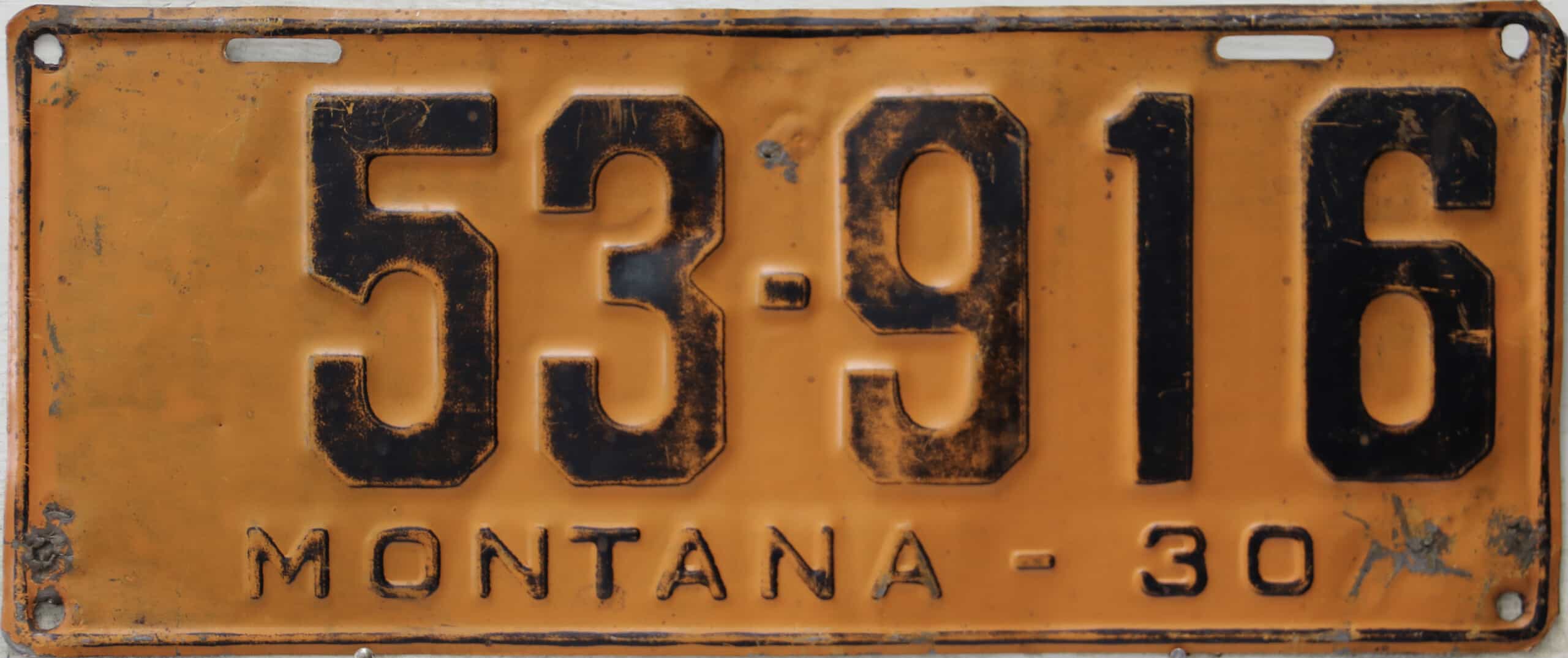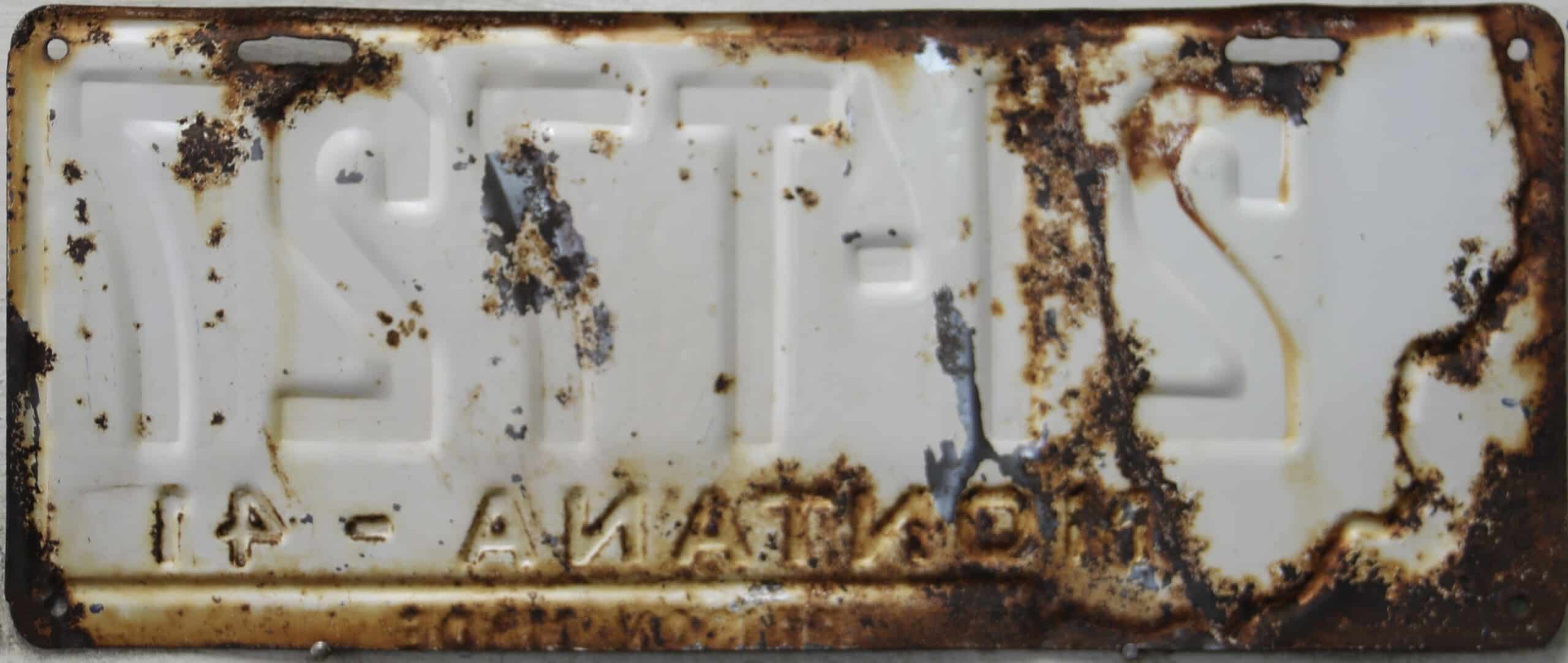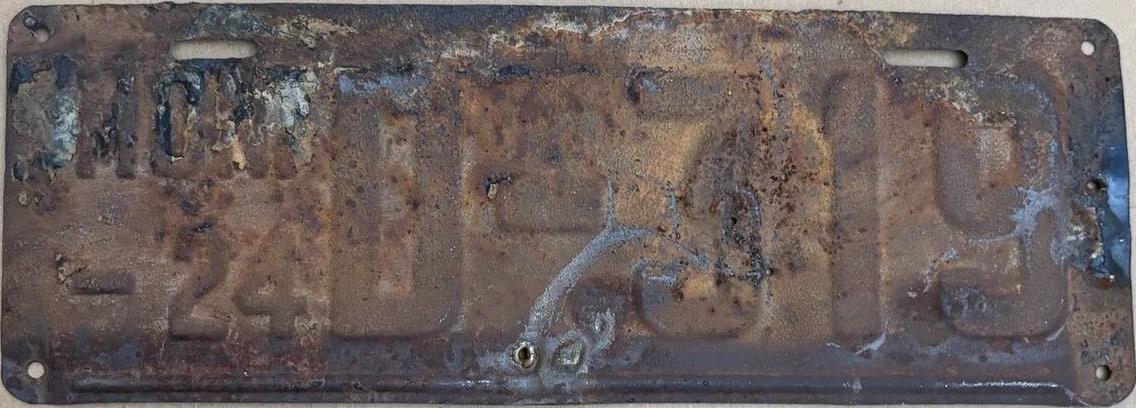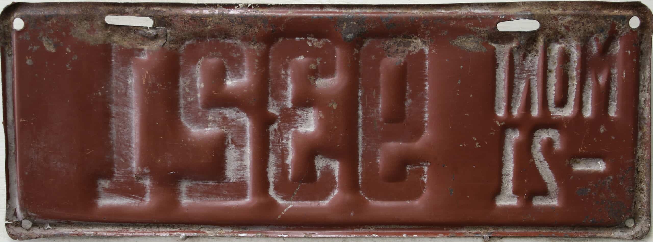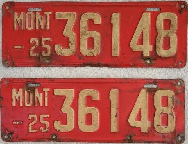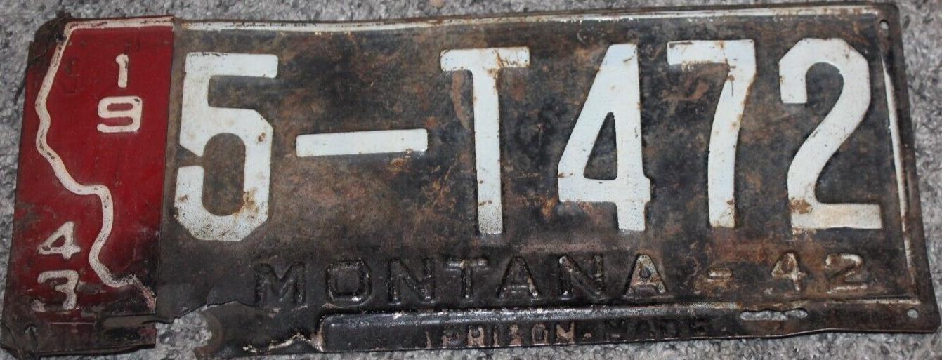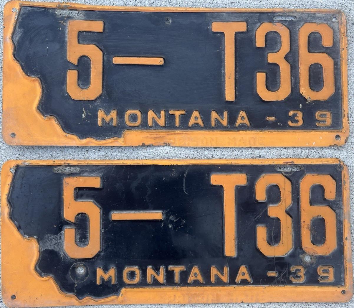 | 1941, старший известный номер мотоциклов - 129. легковые автомобили - 1-9003, 2-124, 2-4458, 3-7007, 4-325, 4-2691, 6-5566, 12-1366, 20-2883, 29-258, 43-857, обратная сторона. грузовики - 15-T110 (перекрас), 21-T727, 54-T9, обратная сторона. образец знака для отделений дорожной полиции - 00-000. дополнительный знак прицепа Монтанской железнодорожной комиссии, 1941-1942 - MRC Tr.-323, обратная сторона, был с чёрными буквами на жёлтом фоне.  |