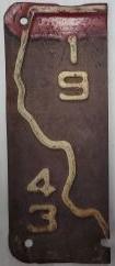 | 1944 - в связи с военной экономией металла самые массовые легковые номера делали из прессованного древесного волокна, остальные - по-старому, - металлические. Говорят, что были деревянные грузовые номера, но мне попадались только металлические. Старший известный номер мотоциклов - 315. легковые автомобили - 1-4392, 1-5593, 2-45, 7-1974, 9-317, 27-390, 35-127, 36-345, 54-289, обратная сторона. грузовики - 20T1136, 34-T45, обратная сторона. прицепы - 9-TR38, 43-TR50, 47-TR48, обратная сторона.  |