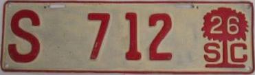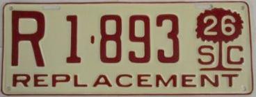 | 1926, старший известный номер, легковые - A125-102, B12-041, C19-999, D 1-883, E 2-794, F 430, G 67, грузовики - H 12-584, P 24, O 80, Q 28, замена - R 1-882, дилеры - X 2-149, прицепы - T 270, S 712(?). легковые до 2000 фунтов - A41-821. замена - R 1-893 (перекрас), R 1-954 (перекрас). прицепы(?) - S 712 (перекрас). |