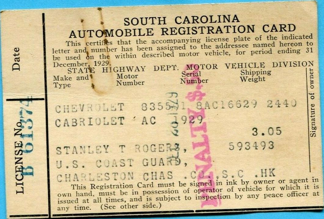 | 1929, старший известный номер, легковые - A-111-997, B-55-615, C-23-844, D-11-579, E-5-177, F-45, грузовики - H-19-941, J-119, I-370, дилеры - X-2-375. легковые до 2000 фунтов - A-3-003 (перекрас), A-5-769. легковые 2001...2500 фунтов - регистрационная карточка на Шевроле-АЦ 1929 года, номер B-61-374, обратная сторона, номер получен 29 XII 1929, за три дня до замены на номера 1930 года. легковые 2501...3000 фунтов - C-23-844. |