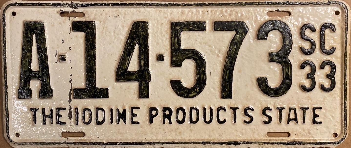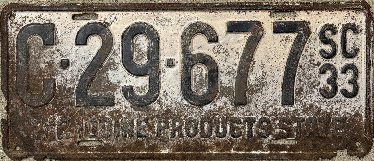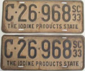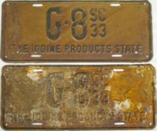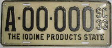 | 1933, старший известный номер, легковые - A-14-573, B-62-151, C-39-272, D-6-479, E-5-340, F-1-651, G-599, грузовики - H-6-718, J-6-992, грузовики департамента шоссейных дорог - W-787, замена - R-1-154, мотоциклы - Z-210. легковые до 2000 фунтов - A-8-632 (перекрас), A-14-105, A-14-573 (перекрас). легковые 2001...2500 фунтов - B-33-261. легковые 2501...3000 фунтов - C-947 (перекрас), C-6-822, C-8-608, C-26-968, C-29-677. легковые 4501...5000 фунтов - G-8. образец знака для отделений дорожной полиции - A-00-000. |