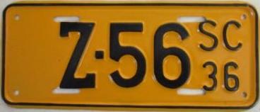 | 1936 на полгода, до 30 IV 1936, старший известный номер (от 50-000), легковые - A-63-905, B-99-357, C-95-758, D-57-294, F-50-788, грузовики - H-52-448. легковые до 2000 фунтов - A-53-099, обратная сторона. такси 2001...2500 фунтов (синие на белом) - B-71-981, обратная сторона. легковые 2501...3000 фунтов - C-56-128, C-74-079, C-83-597. легковые 3001...3500 фунтов - D-57-294. образец знака для отделений дорожной полиции - A-00-000. |