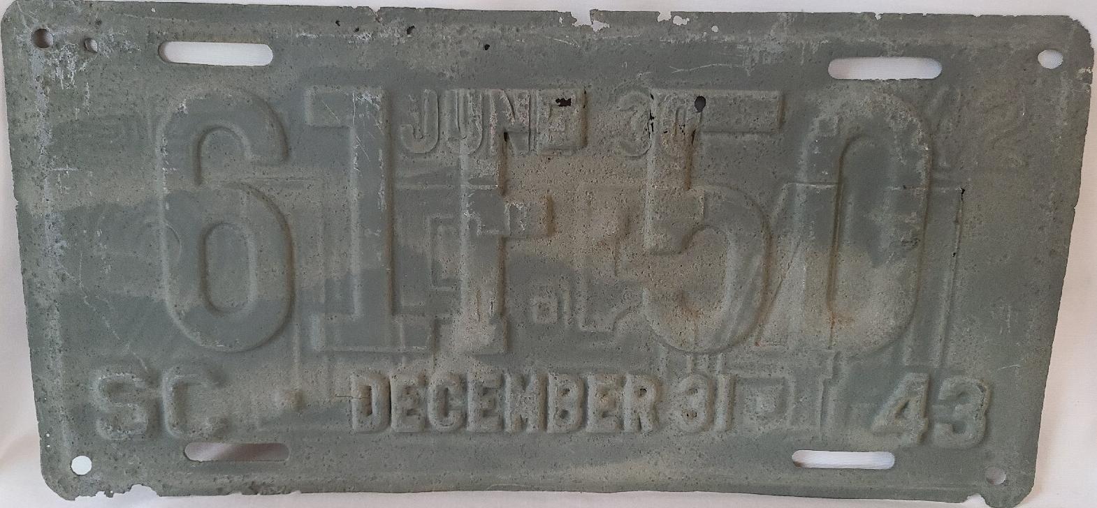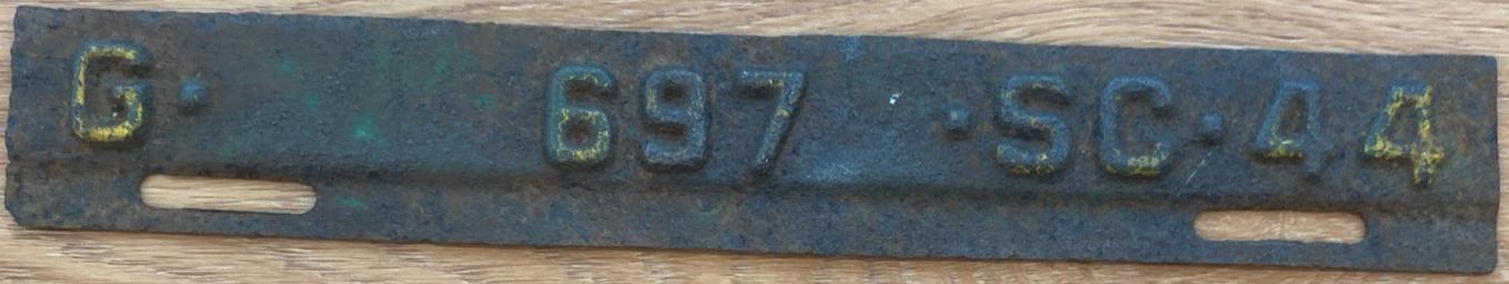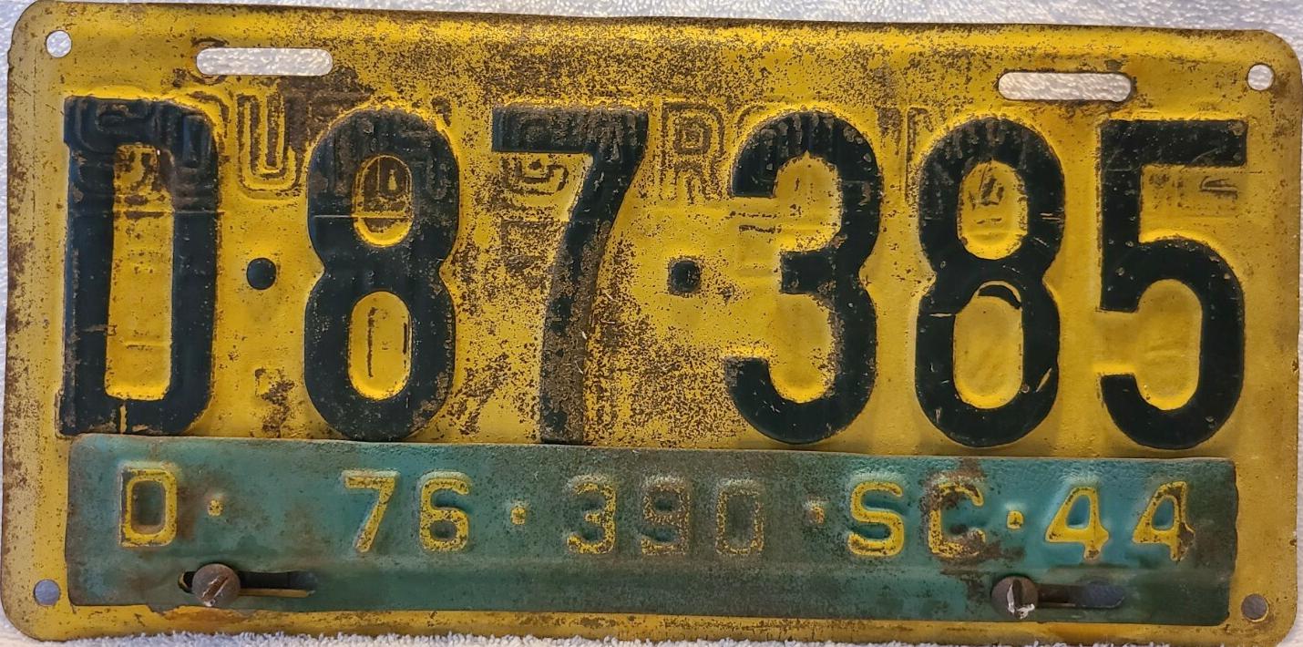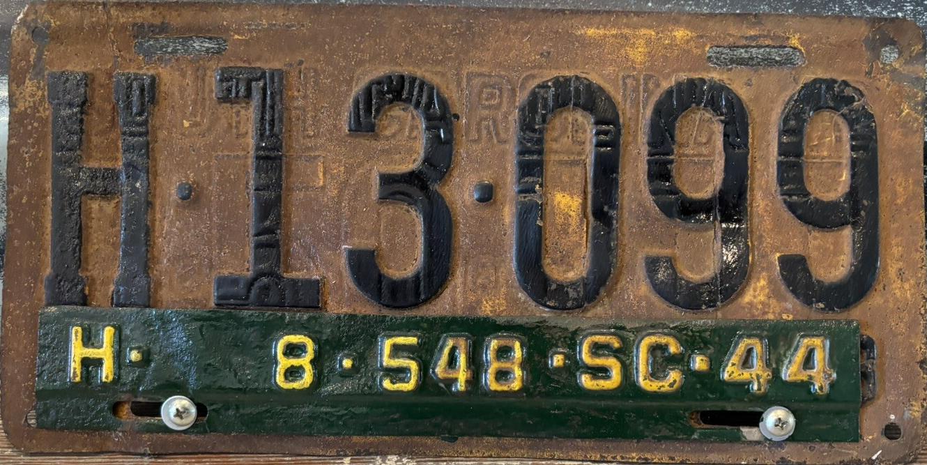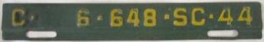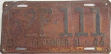 | 1944, номера табличек продления совпадали по классу, но не совпадали номерами со знаками 1943 года, старший известный номер на табличках, легковые - A-1-377, B-39-172, C-124-220, D-80-057, E-5-476, G-697, грузовики - H-21-199, J-4-185, L-1-708, N-268, частные автобусы - 5-784, дилеры - X-2-036, мотоциклы - Z-450. легковые 2501...3000 фунтов - табличка C-6-648. легковые 3001...3500 фунтов - табличка D-76-390 на знаке D-87-385, перепечатка знака E-11-126 1942 года, обратная сторона, обратная сторона таблички. легковые 3501...4000 фунтов - табличка E-5-476 на знаке E-6-524 (перепечатка). легковые 4501...5000 фунтов - табличка G-697. грузовики до 1 тонны на пневматических шинах - табличка H-8-548 на знаке H-13-099, перепечатка знака 1942 года, обратная сторона, обратная сторона таблички. |
