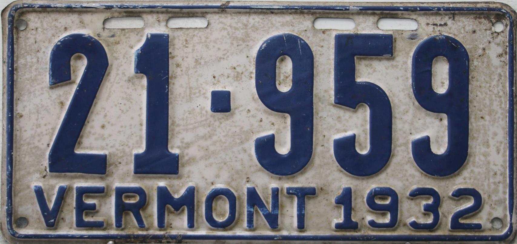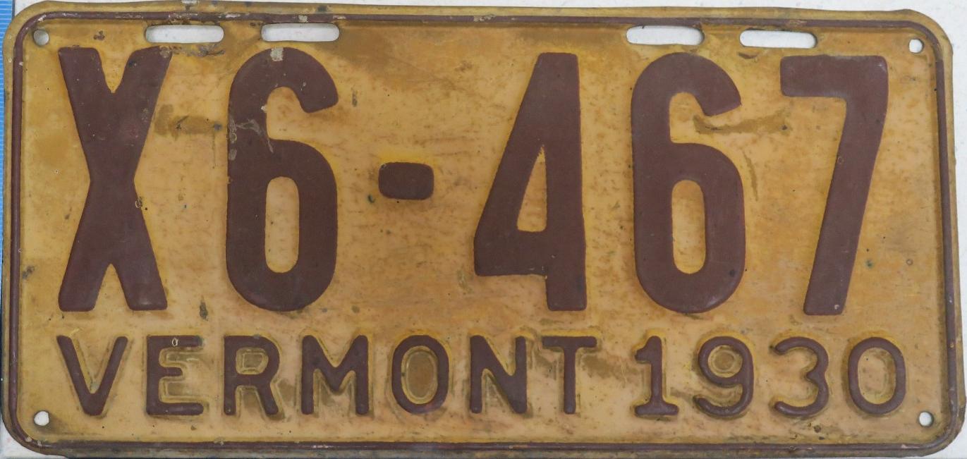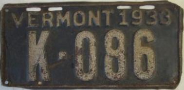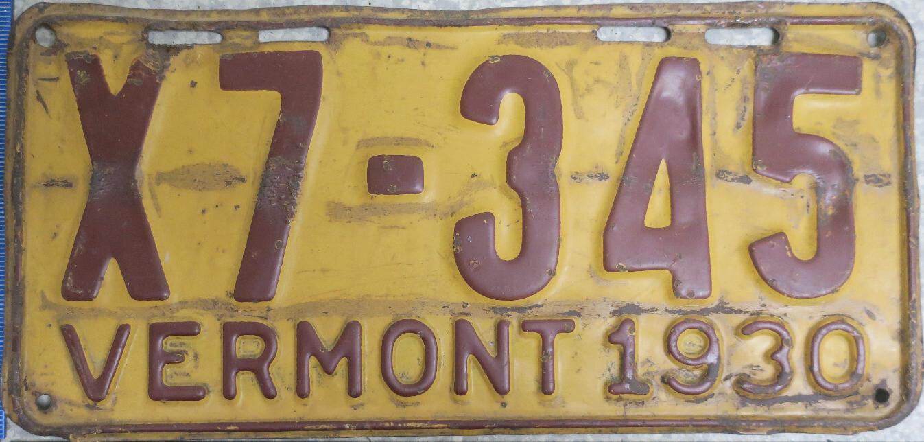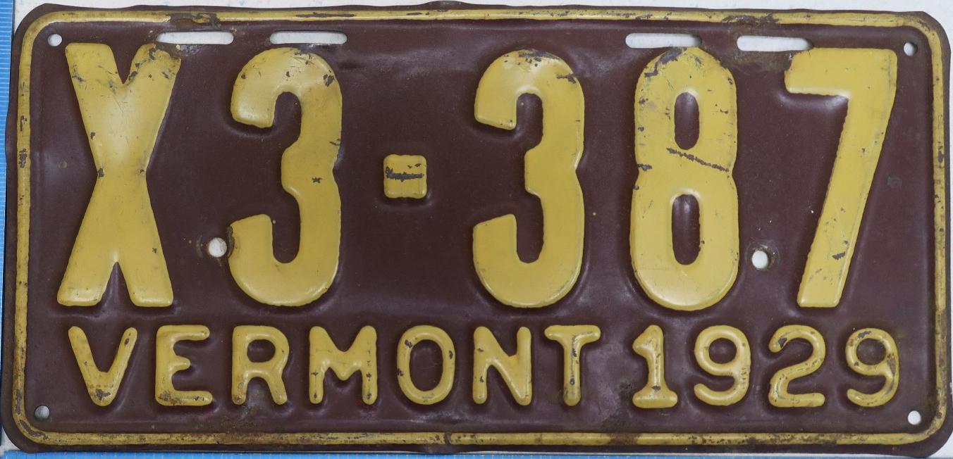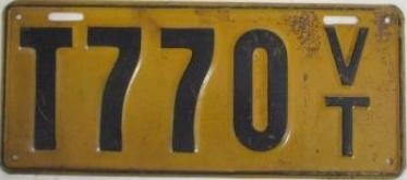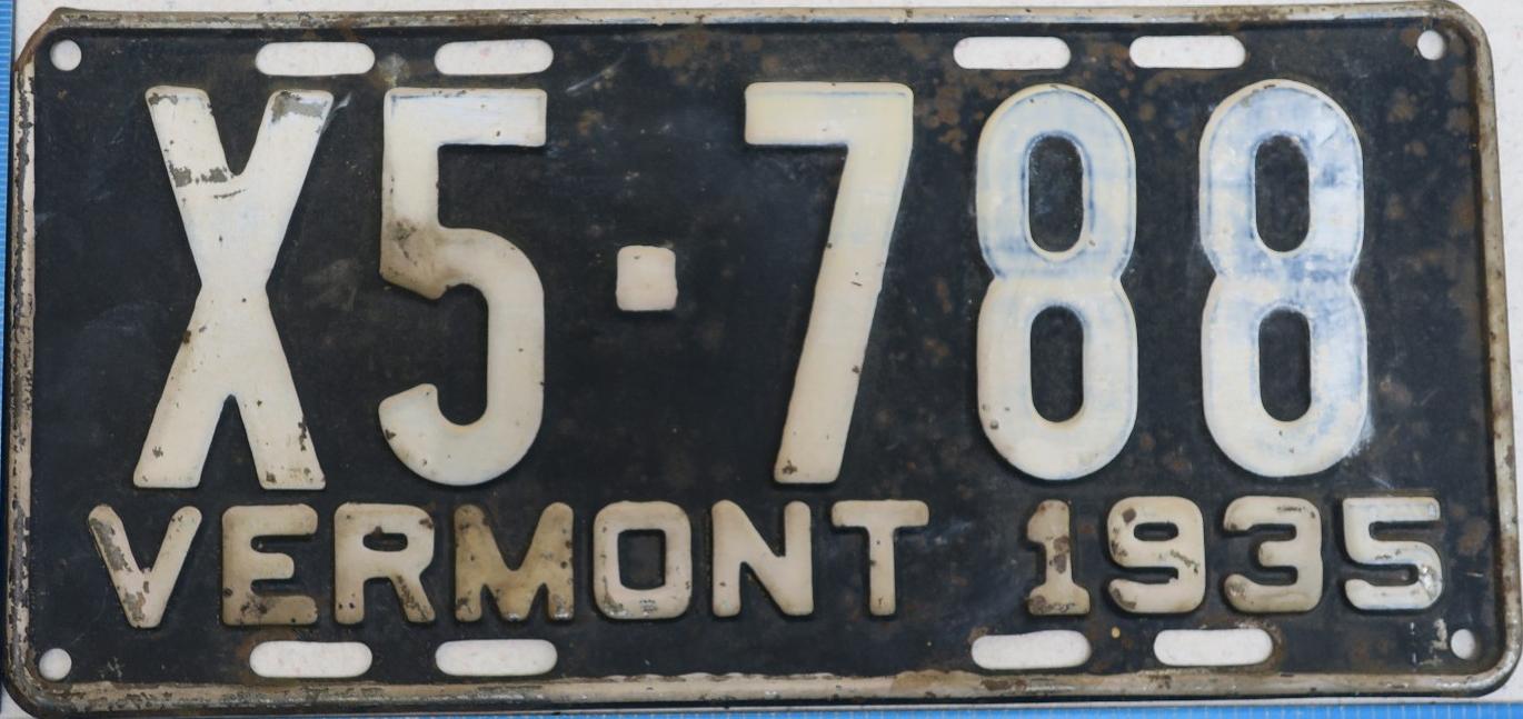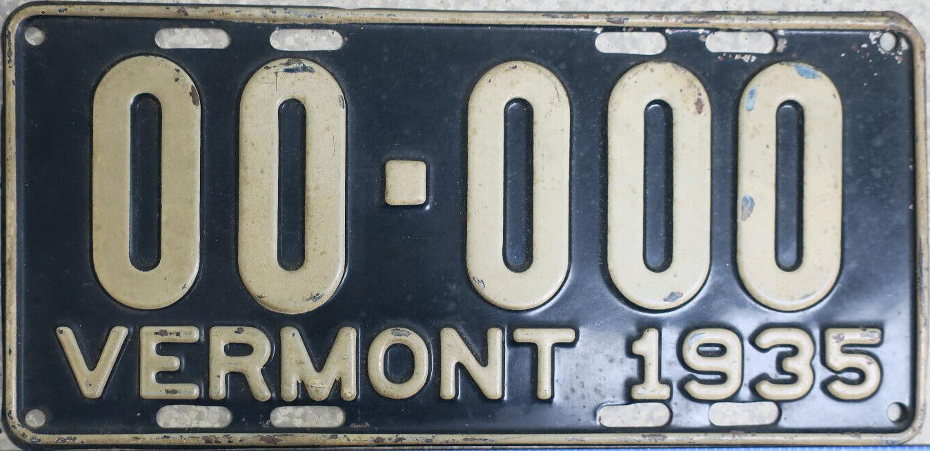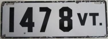 | 1935, у большинства знаков VERMONT с круглой O, но на некоторых она угловатая (см. X5-788), старший известный номер, легковые - 101 ... 72-232, грузовики - X9-546, ремонтники - RP-636, специальные - 194, прицепы - T-1063, мотоциклы - 498. Действие знаков 1935 года продлено до 31 III 1936. легковые - 179, 1-860, 39-892, 42-083, 59-496, обратная сторона. грузовики - X5-788, обратная сторона. образец знака для отделений дорожной полиции - 00-000, обратная сторона. мотоциклы - 402, 489, обратная сторона. |