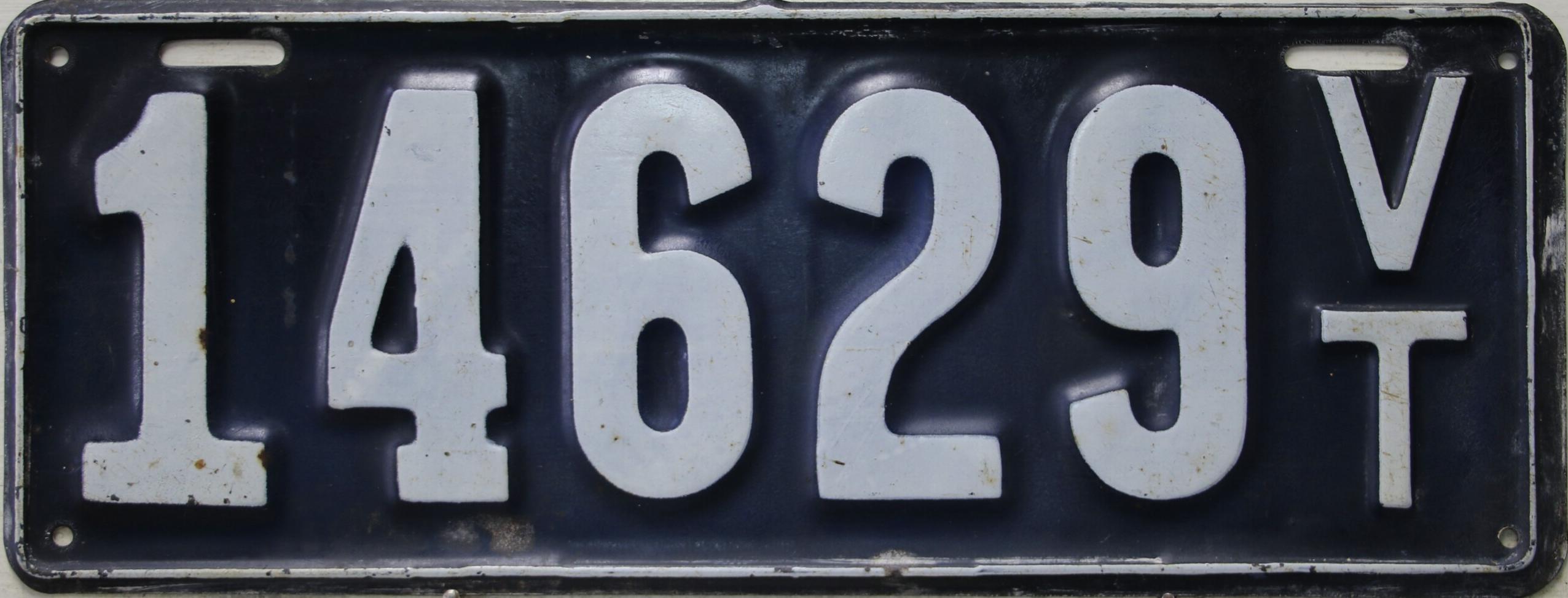 | 1939, старший известный номер, легковые - 81 000, грузовики - X9 429, ремонтники - RP 536, прицепы - T 2034, мотоциклы - 363. легковые - 1 659, 41 284, 42 796, 73 829, 81 000, обратная сторона. грузовики - X6 203, обратная сторона. ремонтники - RP 11. дилеры - D 067. прицепы - T 611. мотоциклы - 347, обратная сторона. |