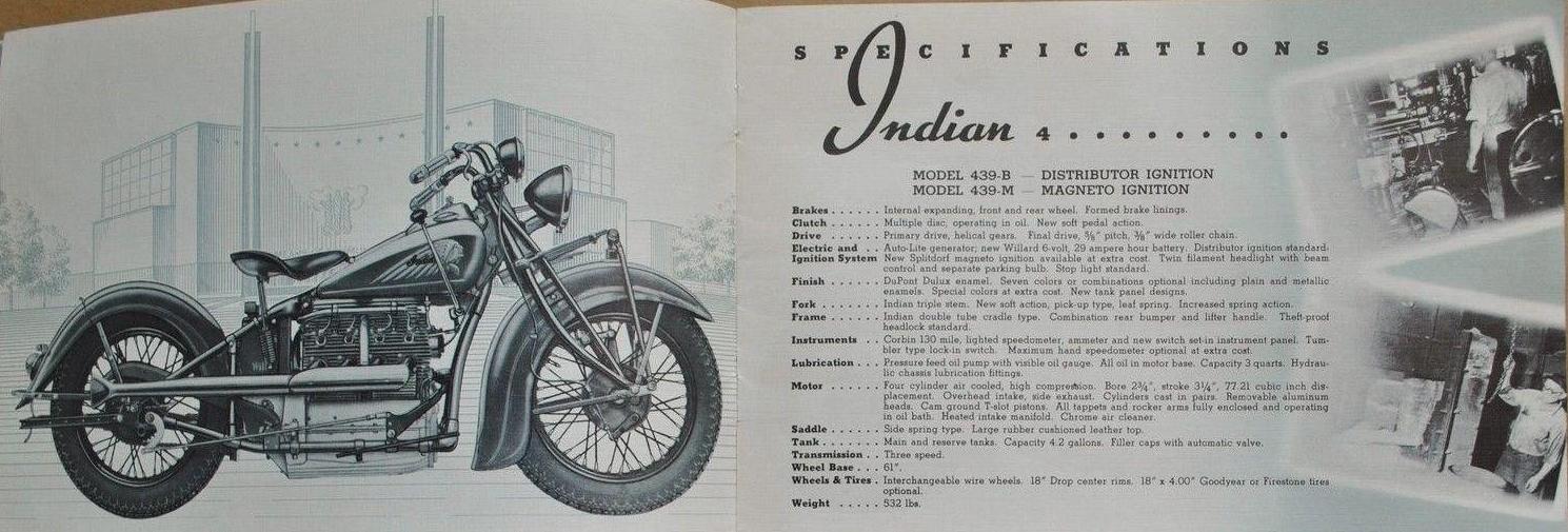 | 1939 339B Chief, distributor ignition, 385$ 339M Chief, magneto ignition, 400$ 339BM Chief "Bonneville" (high performance), magneto ignition, 425$ Standard Sidecar, ?$ Sport Sidecar, ?$ |