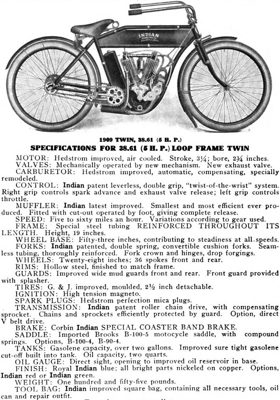 | 1938 338B Chief, distributor ignition, 405$ 338M Chief, magneto ignition, 420$ 338DM Chief, "Daytona"(high performance), magneto ignition, 445$ Standard Sidecar, ?$ Sport Sidecar, ?$ |
