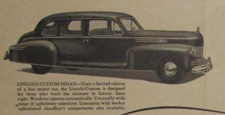 | 1942 Линкольн серий 26Х Зефир, 26Х Континентал, 268Х Кастом (с 27 IX 1941), 6547 штук, гражданская продукция прекращена в начале 1942. V12-цил. SV - 304,97 куб. дюймов (4997,6 куб. см) - 130 л.с., диаметр цилиндра 215/16", ход поршня 33/4" серия 26Х Зефир (Lincoln 26H Zephyr), 125-дюймовая колёсная база, 6098 штук 1942 Линкольн-Зефир клуб купе, 20кБ, 1942 Линкольн-Зефир седан, 23кБ серия 26Х Континентал (Lincoln 26H Continental), 125-дюймовая колёсная база, 336 штук 1942 Линкольн-Континентал клуб купе, 25кБ, 1942 Линкольн-Континентал открытое купе, 91кБ серия 268Х Кастом (Lincoln 268H Custom), 138-дюймовая колёсная база, 113 штук 1942 Линкольн-Кастом 8-местный седан, 14кБ  |