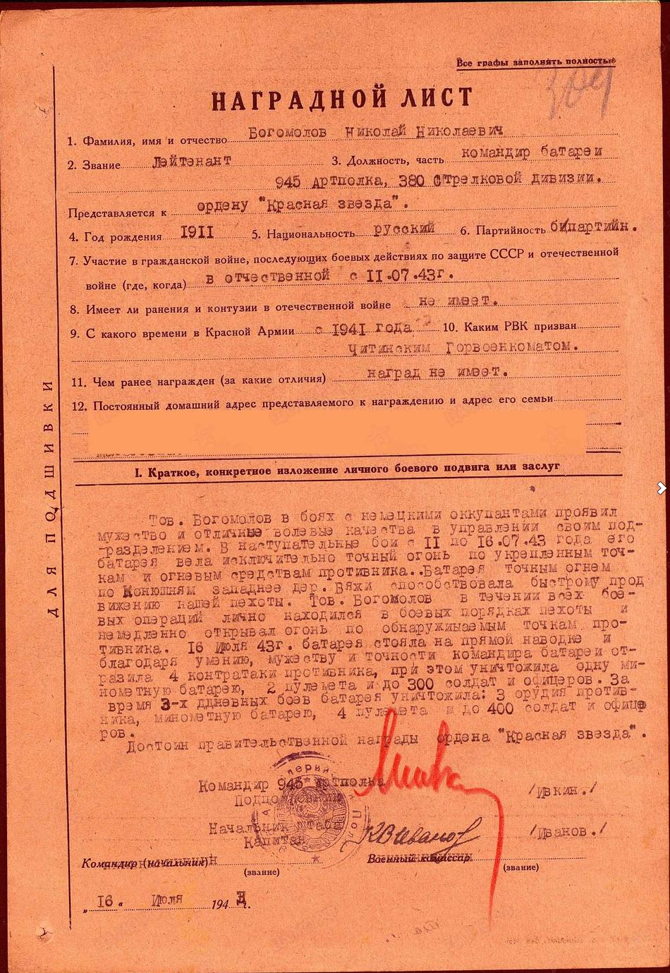 На фотографии (она раскрывается) - наградной лист от 16 июля 1943 года.