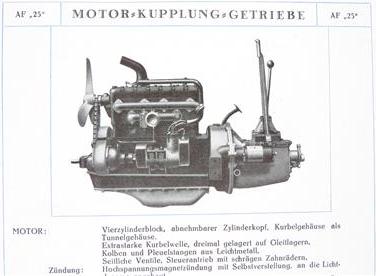 моторы: рядные 4-цил., AFN 9/36 Normal - 2837 см3 (85x125мм), 36 л.с.; AFN/39, AFN 1g, AFN 11/42 PS и AFN Spezial - 3324 см3 (92x125мм), 42 л.с. (AFN Spezial - 55 л.с.)