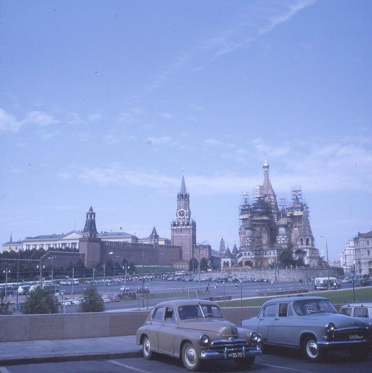 73-44 ММТ, обратите внимание на шашечки на багажнике (на капоте они тоже есть). Их ввели и нарисовали в 1964 в московских таксопарках. Однако, по соседней машине видно, что по крайней мере 5-й таксопарк ещё в 1965 году этого не сделал. Шашечки на капоте в светлое время позволяли ловящим такси издалека заметить машину и успеть протянуть руку горизонтально в останавливающем жесте (почти исчезнувшем в наше время заказа такси по интернету). На фотографии, сделанной в Москве в 1966 году, интересна средняя машина. Чёрная точка над ветровым стеклом показывает, что там была антенна. То есть, это обычная ГАЗ-21И, попавшая на службу в такси и переоборудованная в таксопарке (на место радиоприёмника устанавливался таксометр), - такое встречалось не так уж редко. 21-35 ЛЕГ, - ещё одна ГАЗ-21И в одежде такси, у неё даже осталась антенна радиоприёмника, зато снят олень и молдинг в центре капота, а вместо молдинга - какая-то чёрная полоса, скорее всего, изолента, закрывающая отверстия.