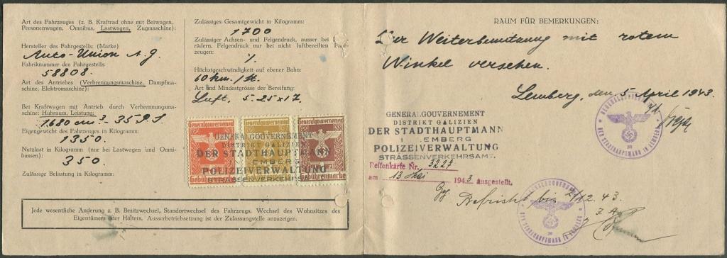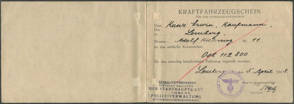 В годы первой фашистской оккупации 1941-1944 во Львовской области были немецкие, венгерские и словацкие военные номера и гражданские номера всех земель и ведомств Германии на мобилизованных машинах. Территорию оккупированной Львовской области немцы присоединили к Генерал-губернаторству. Здесь были введены знаки серии Ost немецкого образца для местного гражданского транспорта.