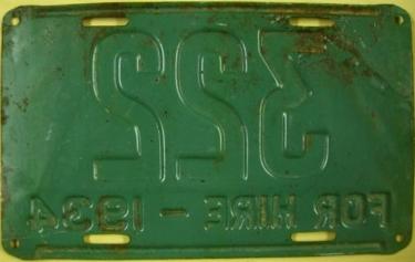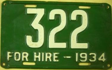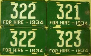 | 1934, известные диапазоны: автомобили и мотоциклы - 133 ... 3169, такси - 125 ... 479. автомобили и мотоциклы - 25 (перекрас), 893 (перекрас), 1399 (перекрас). такси - 321, 322, 323, 322, обратная сторона. |
