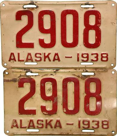 | 1936, известные диапазоны: автомобили и мотоциклы - 572 ... 4294, такси - 6 ... 368. автомобили и мотоциклы - 572 (Шевроле 1934 года, Кетчикан), 1267. |