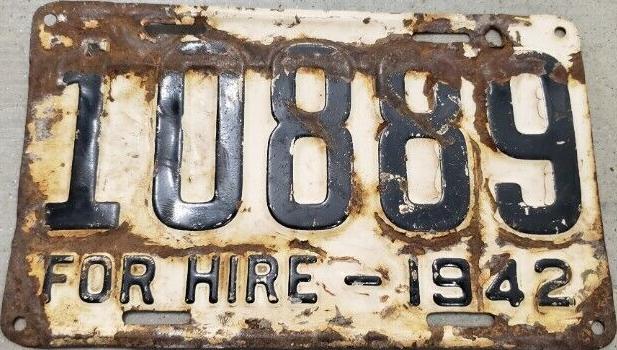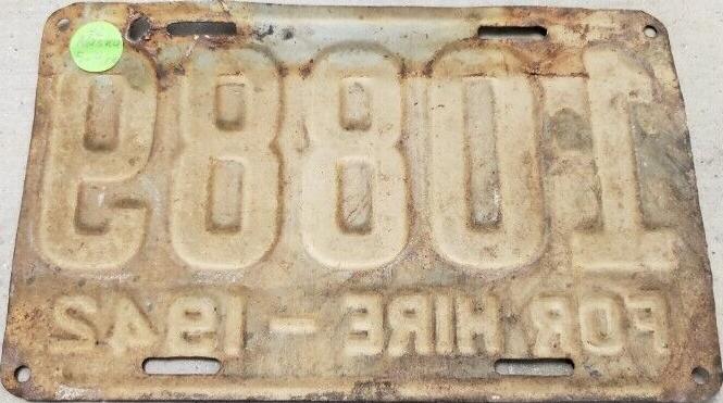 | 1942, известные диапазоны: автомобили - 111 ... 7889, такси - 10108 ... 10940. автомобили - 830, 7727. такси - 10889, обратная сторона. образец знака для отделений дорожной полиции - 0000. |