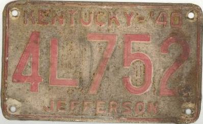 1944 (округ Carlisle), 1944 (Carter), 1943 (мотоцикл), 1943 (мотоцикл), 1942 (McCracken), 1942 (McCracken), 1942 (мотоцикл), 1941 (Форт Нокс (военная база)), 1941 (Форт Нокс (военная база)), 1941 (Mason и Campbell), 1941 (Daviess), 1941 (McCracken), 1941 (McLean), 1940 (Jefferson, грузовик), 1940 (Jefferson), 1940 (значок шофёра), 1939 (Breckinridge), 1939 (Carlisle), 1939 (Jefferson), 1939 (обратная сторона), 1939 (McCracken), 1938 (Barren), 1938 (Fayette), 1938 (Hardin), 1938 (Jefferson), 1938 (мотоцикл), 1937 (Bourbon), 1937 (Harrison), 1937 (Henry), 1937 (Jefferson), 1937 (Lincoln), 1936 (Muhlenberg), 1936 (Pendleton), 1935 (Fayette), 1934 (Caldwell), 1934 (Grayson), 1934 (Jefferson), 1934 (Fulton, грузовик), 1934 (обратная сторона), 1933 (Barren), 1933 (Hopkins), 1933 (Whitley), 1931 (задний), 1931 (Muhlenberg, передний), 1931 (задний), 1930 (задний), 1930 (задний, размер - 15 x 7 дюймов), 1930 (задний), 1930 (знак для въезда частного автомобиля в Провиденс, размер - 31/2 x 3 дюймов), 1929 (задний), 1928 (Muhlenberg), 1927 (Jefferson), 1927 (Kenton), 1927 (Mason), 1927 (обратная сторона), 1926, 1926, 1923 (грузовик), 1923, 1923, 1923, 1922 (грузовик), 1921, 1920, 1919, 1918, 1917
