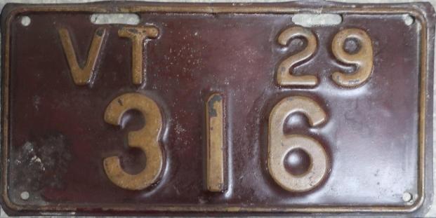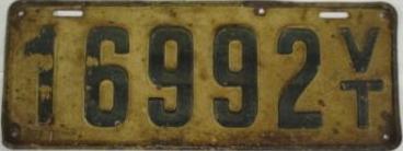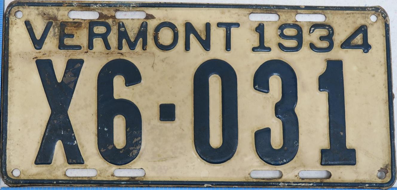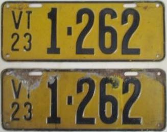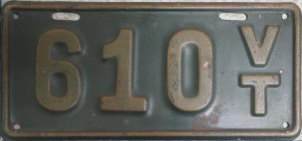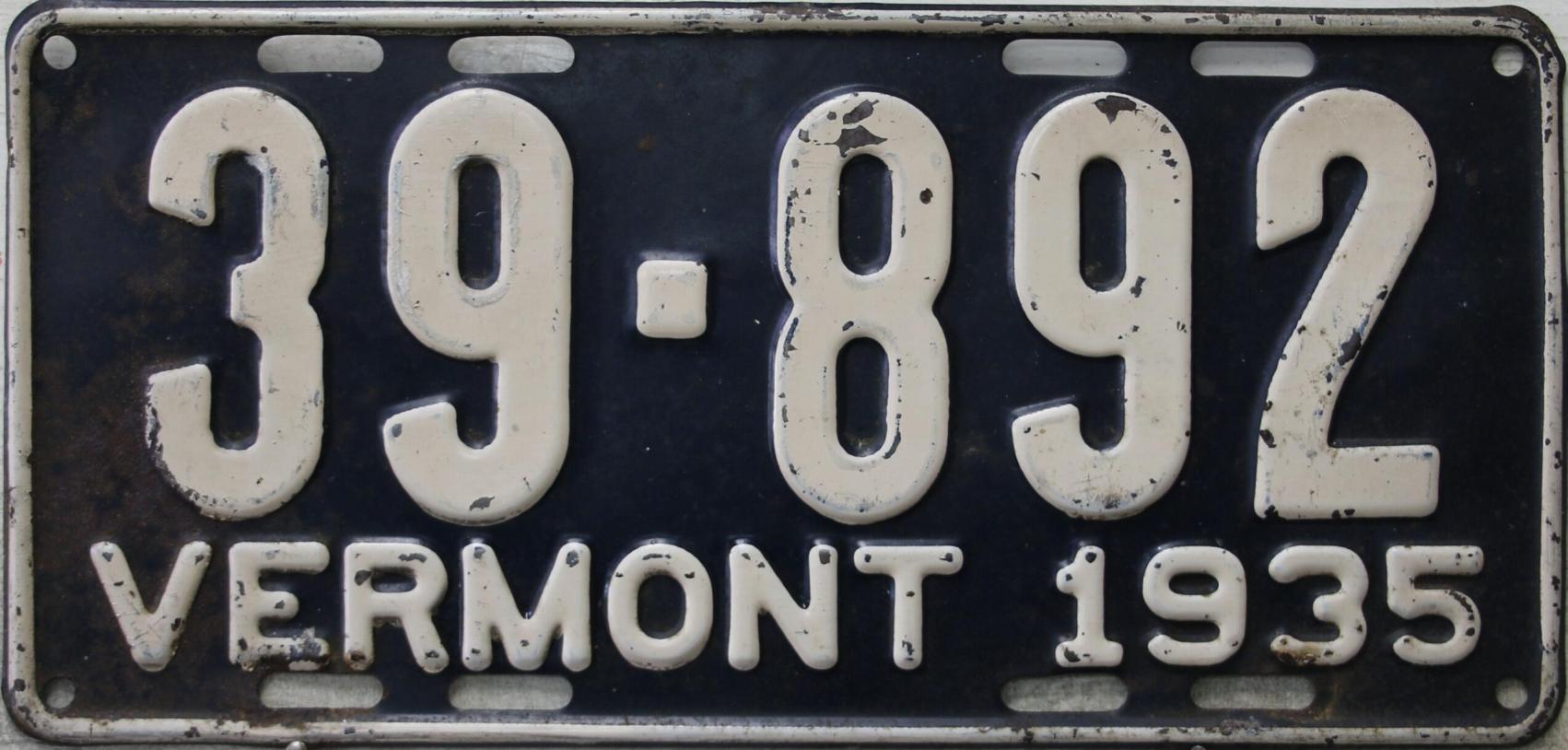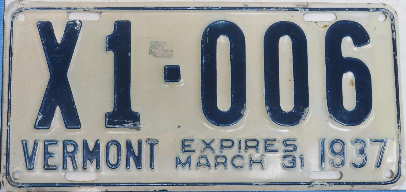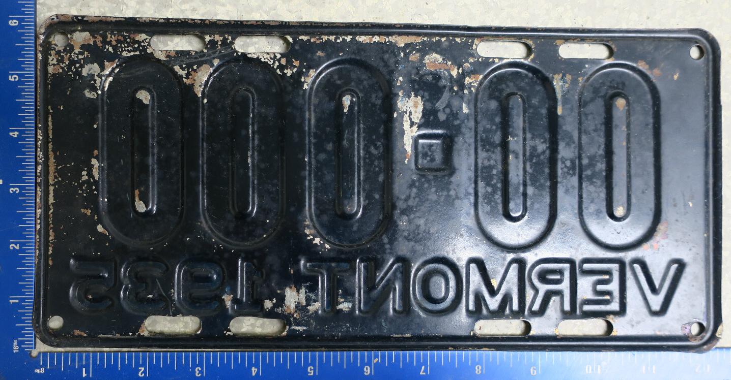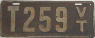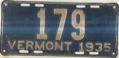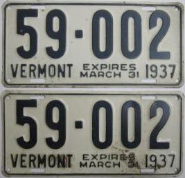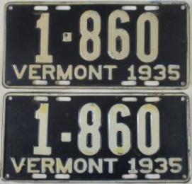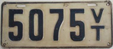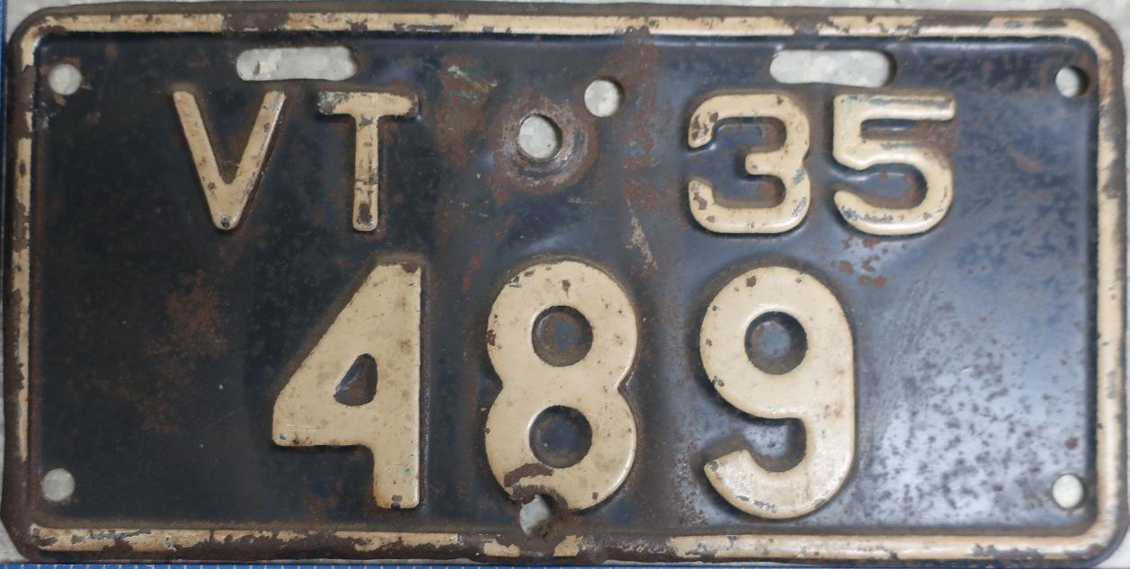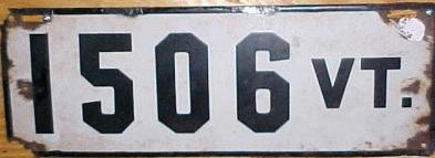| 1935, у большинства знаков VERMONT с круглой O, но на некоторых она угловатая (см. X5-788), старший известный номер, легковые - 101 ... 72-232, грузовики - X9-546, ремонтники - RP-636, специальные - 194, прицепы - T-1063, мотоциклы - 498. Действие знаков 1935 года продлено до 31 III 1936. легковые - 179, 1-860, 39-892, 42-083, 59-496, обратная сторона. грузовики - X5-788, обратная сторона. образец знака для отделений дорожной полиции - 00-000, обратная сторона. мотоциклы - 402, 489, обратная сторона. |