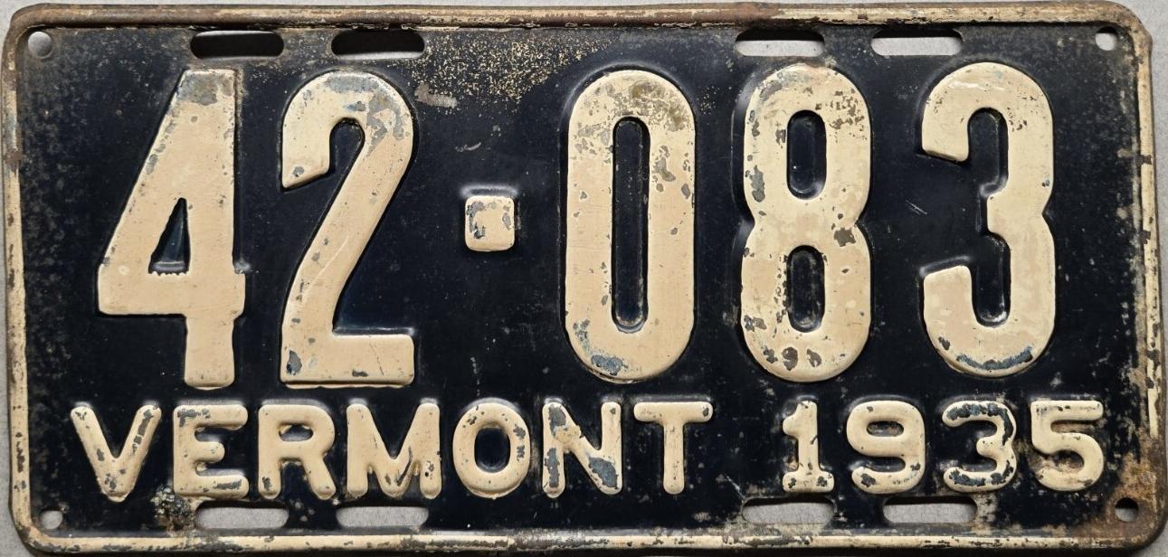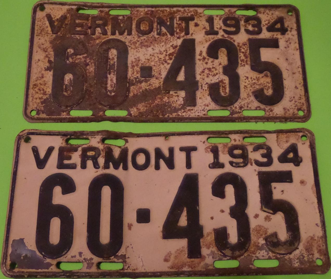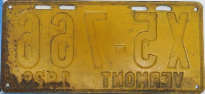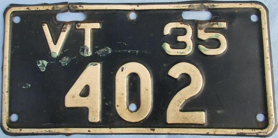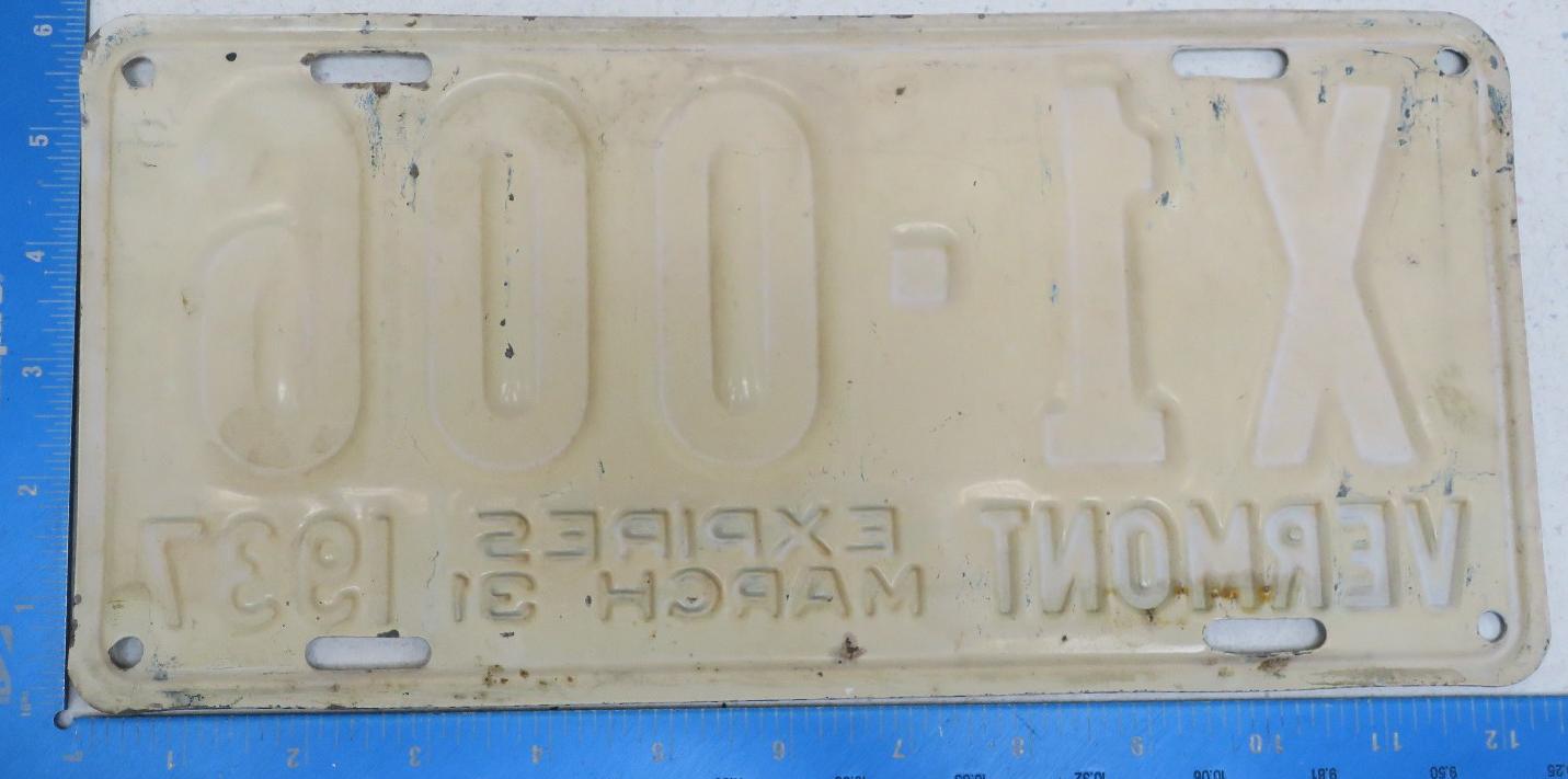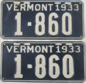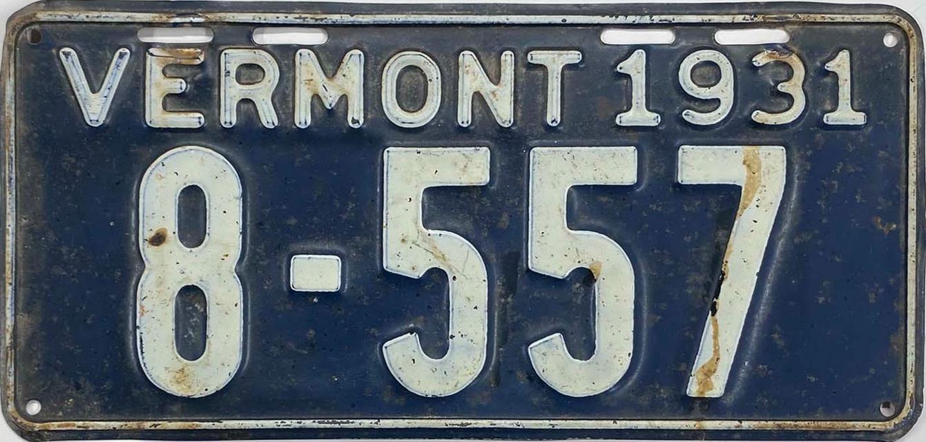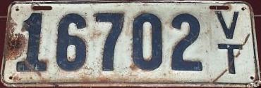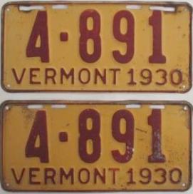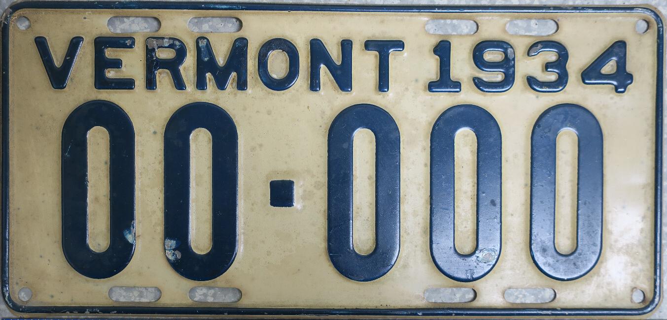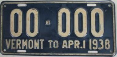 | 1935, у большинства знаков VERMONT с круглой O, но на некоторых она угловатая (см. X5-788), старший известный номер, легковые - 101 ... 72-232, грузовики - X9-546, ремонтники - RP-636, специальные - 194, прицепы - T-1063, мотоциклы - 498. Действие знаков 1935 года продлено до 31 III 1936. легковые - 179, 1-860, 39-892, 42-083, 59-496, обратная сторона. грузовики - X5-788, обратная сторона. образец знака для отделений дорожной полиции - 00-000, обратная сторона. мотоциклы - 402, 489, обратная сторона. |