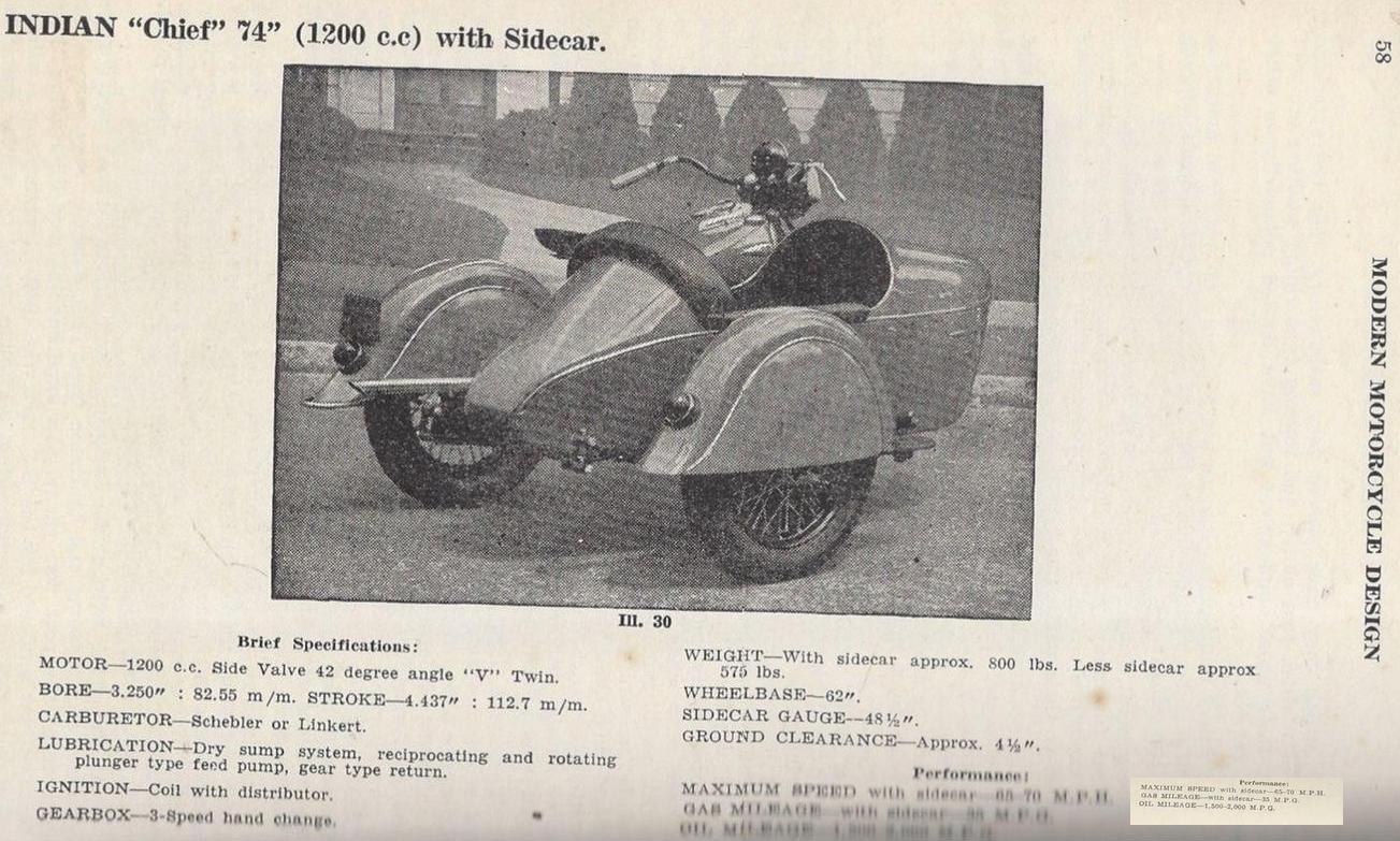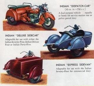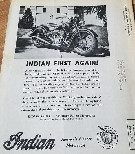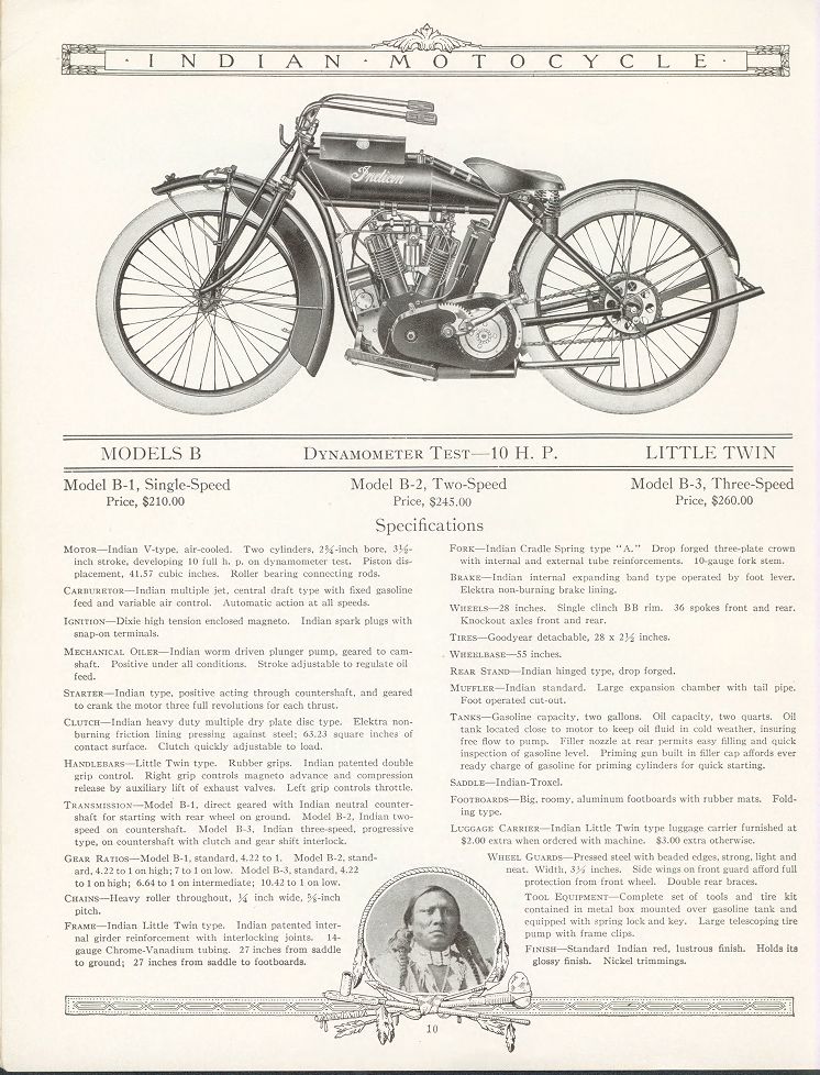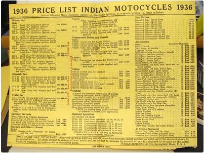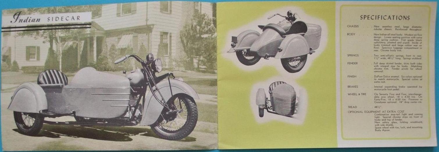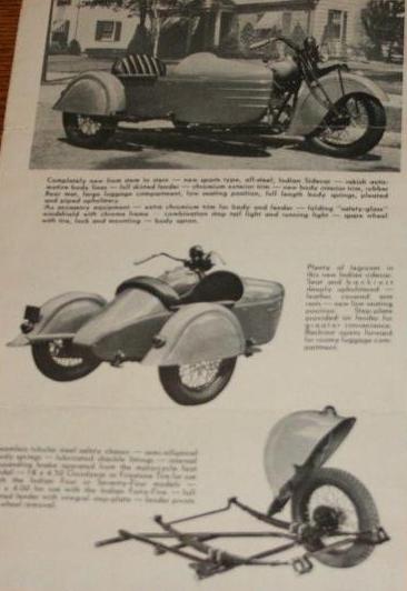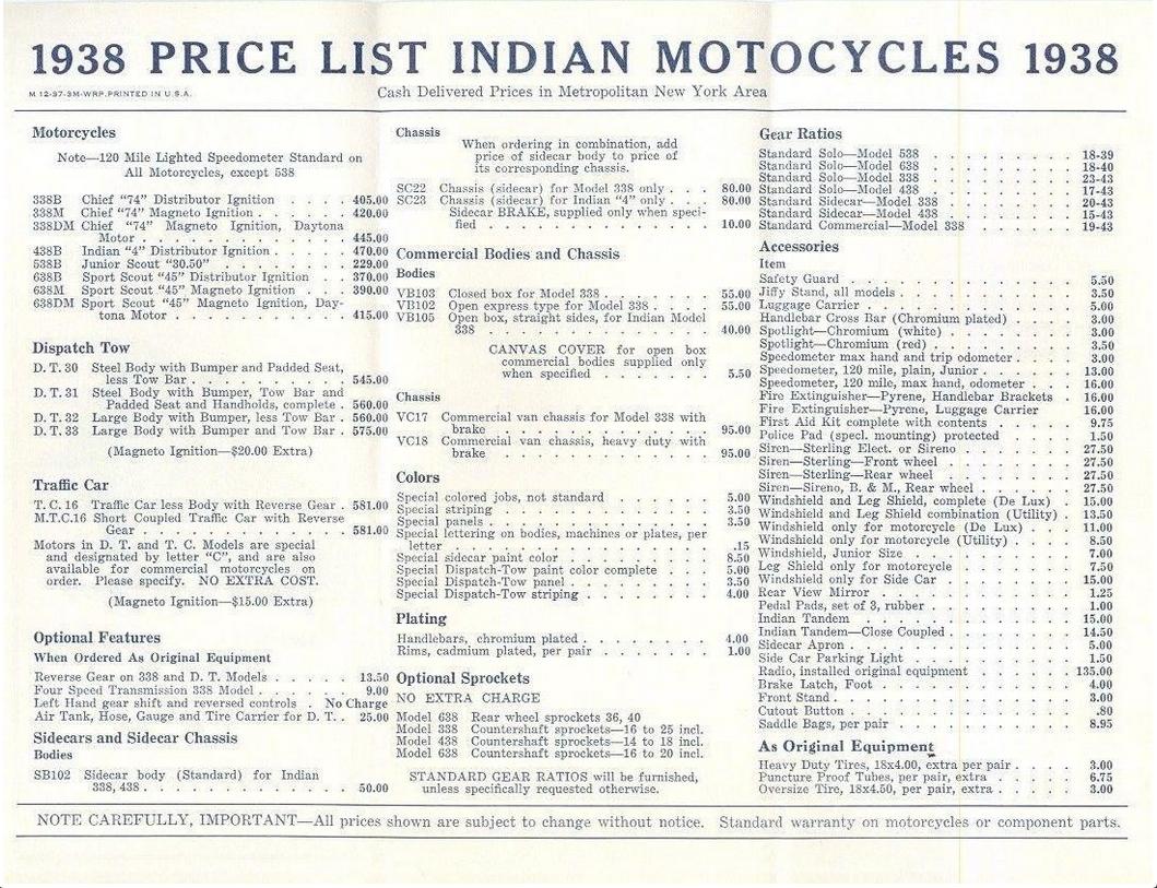 | 1938 338B Chief, distributor ignition, 405$ 338M Chief, magneto ignition, 420$ 338DM Chief, "Daytona"(high performance), magneto ignition, 445$ Standard Sidecar, ?$ Sport Sidecar, ?$ |