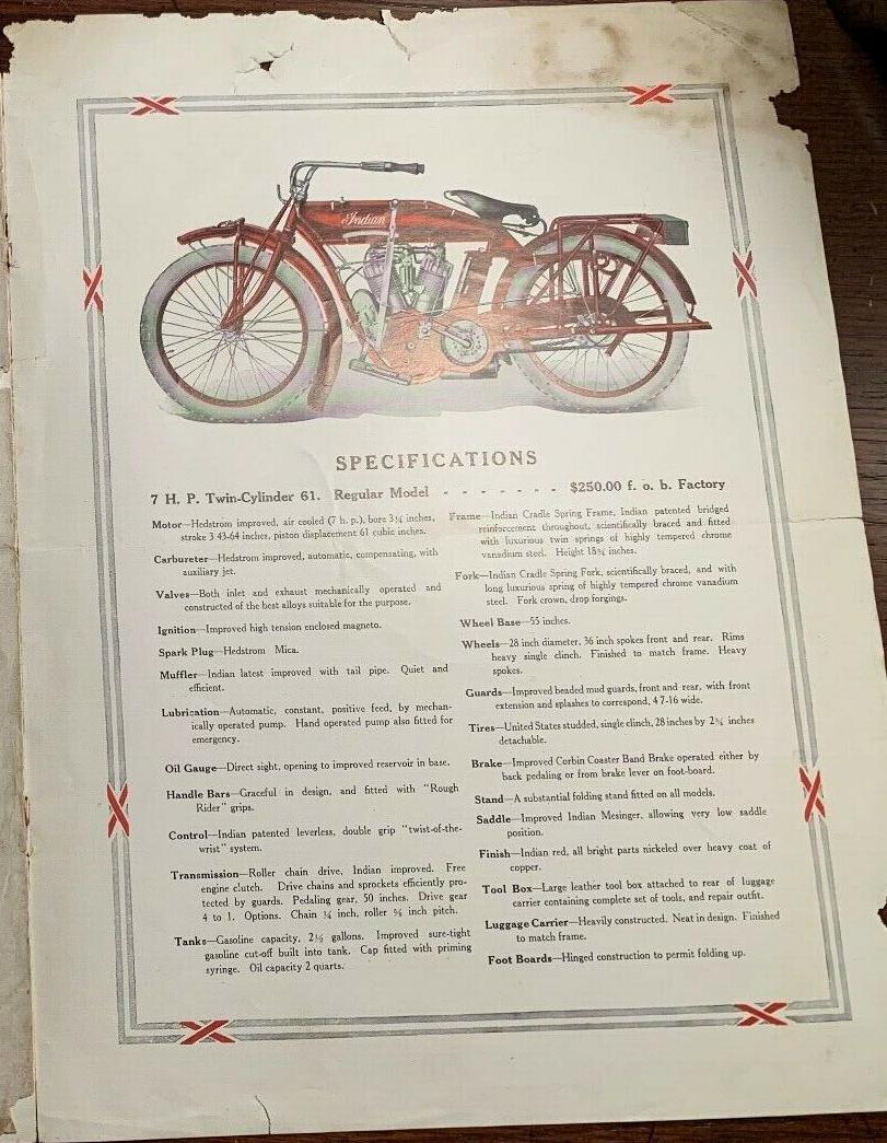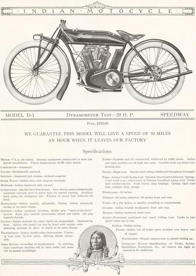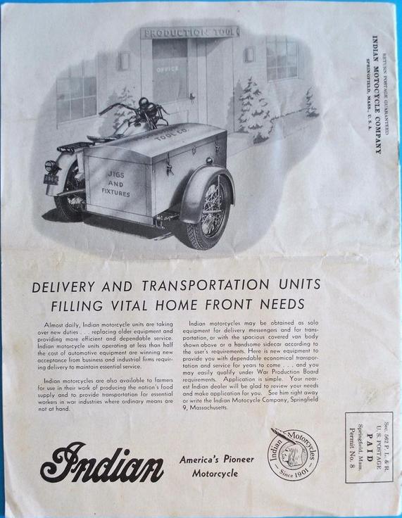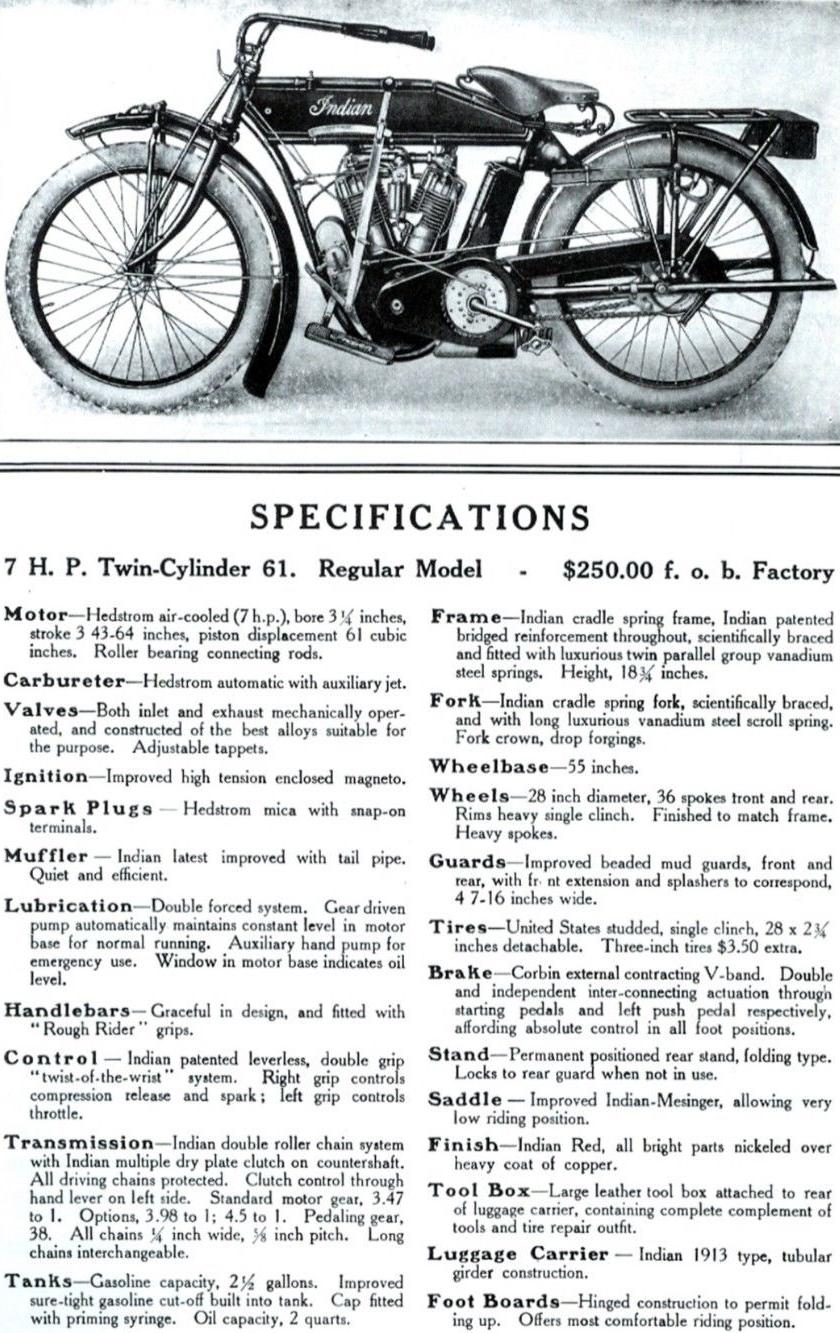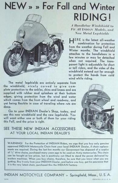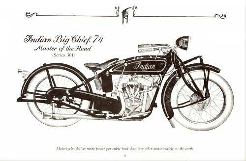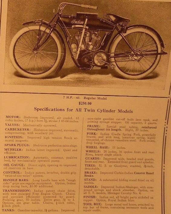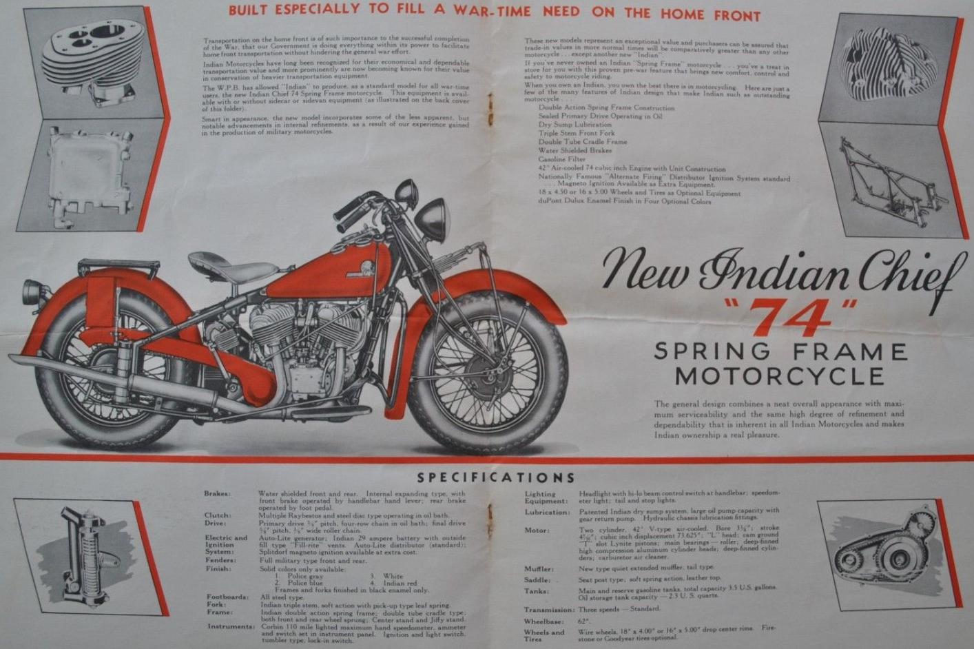 | 1938 338B Chief, distributor ignition, 405$ 338M Chief, magneto ignition, 420$ 338DM Chief, "Daytona"(high performance), magneto ignition, 445$ Standard Sidecar, ?$ Sport Sidecar, ?$ |