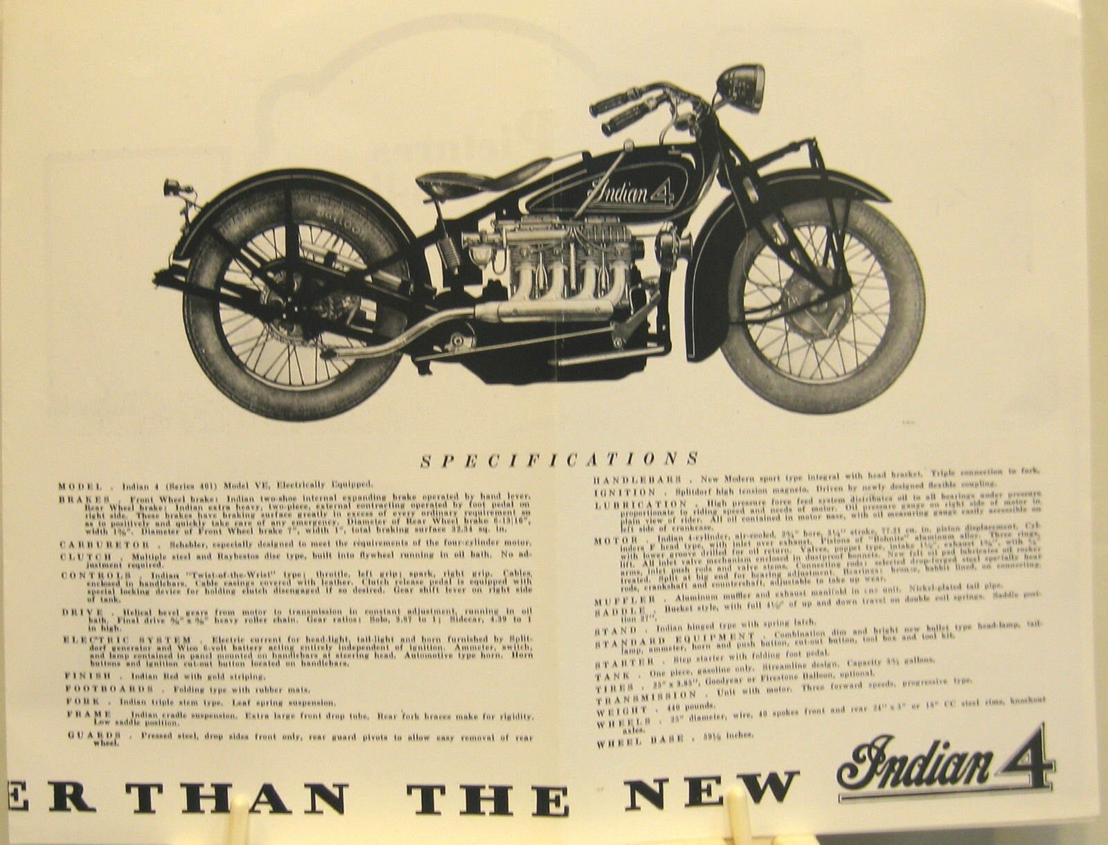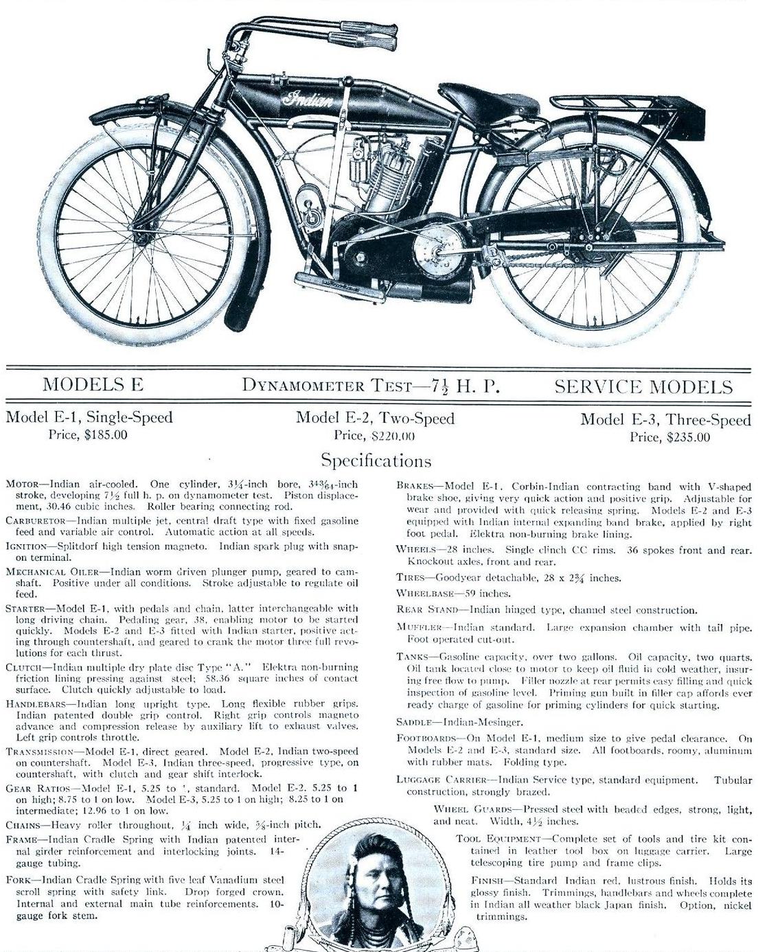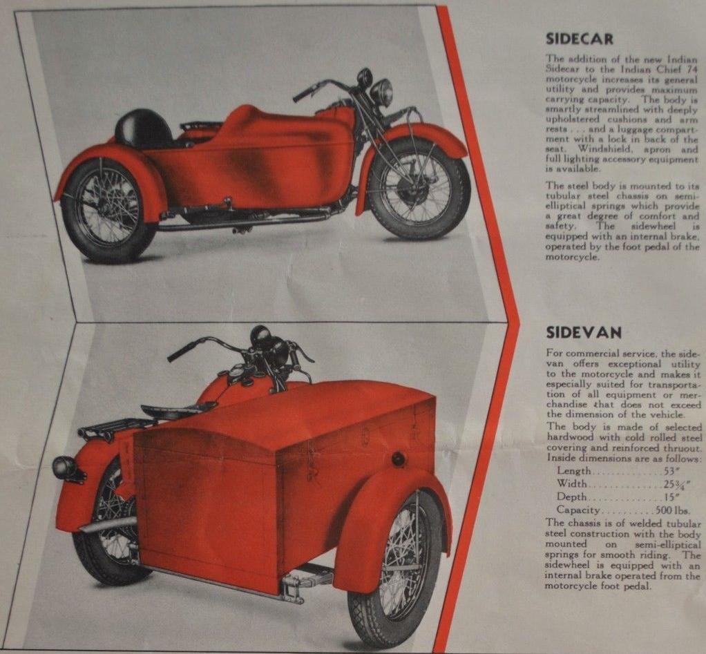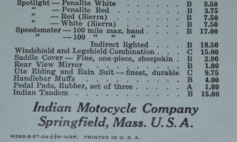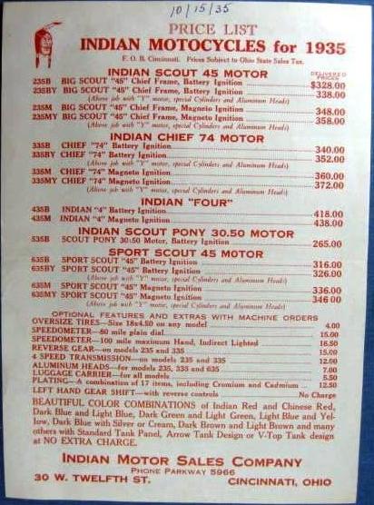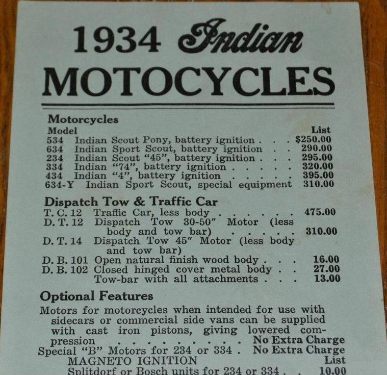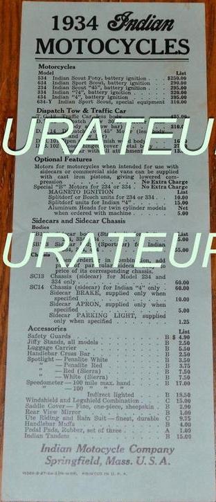 | 1934 Model 334B Chief, battery ignition, 320$ Model 334M Chief, magneto ignition, 330$ Standard Sidecar, ?$ Sport Sidecar, ?$ |
