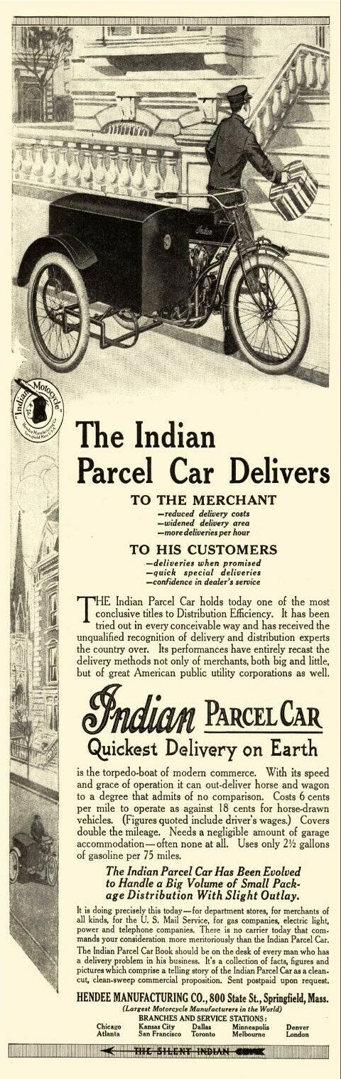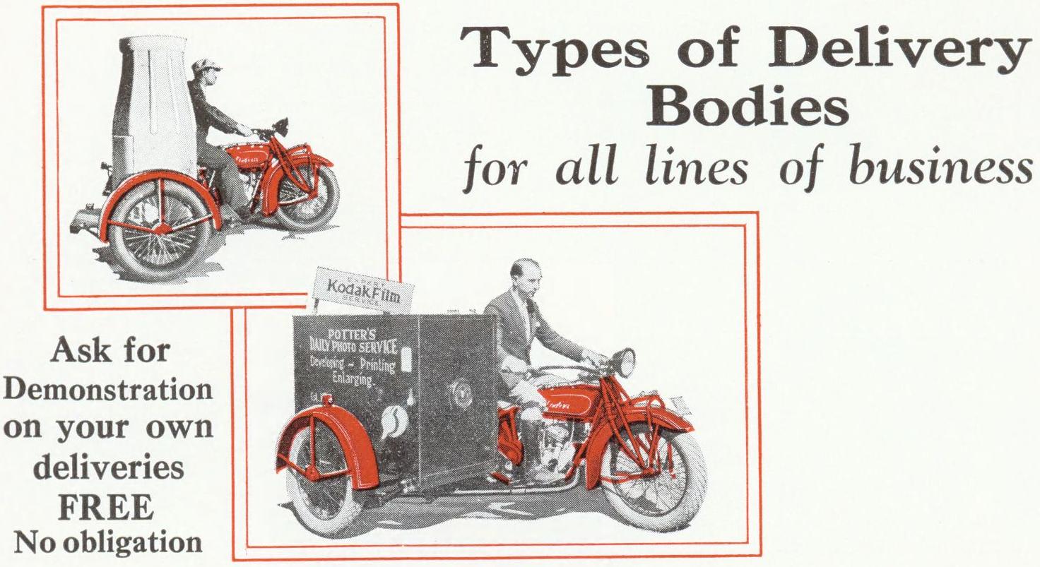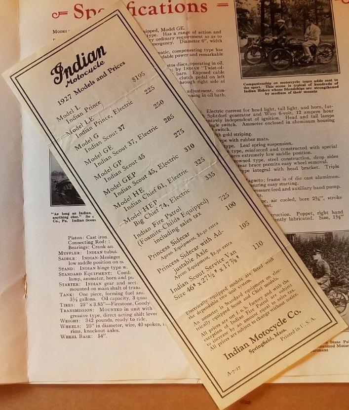 | 1927 Model HE, Chief, magneto ignition, 325$ Model HEP, Big Chief, magneto ignition, 335$ Fire Patrol (foamite-childs equipped), 725$ Model SH, Princess Sidecar, 100$ (with adjustable axle - 105$) (apron equipment - extra 2,50$) |