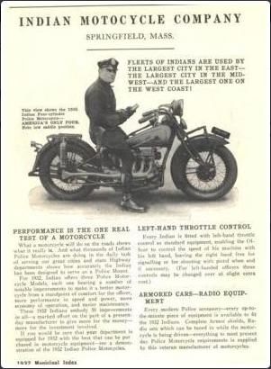 | 1932 (prototypes had different front fender) Model 332 Chief, battery ignition, ?$ Model 332 Chief, magneto ignition, ?$ Model Police Special Chief, magneto ignition, 325$ Model SH, Princess Sidecar, 100$ |
