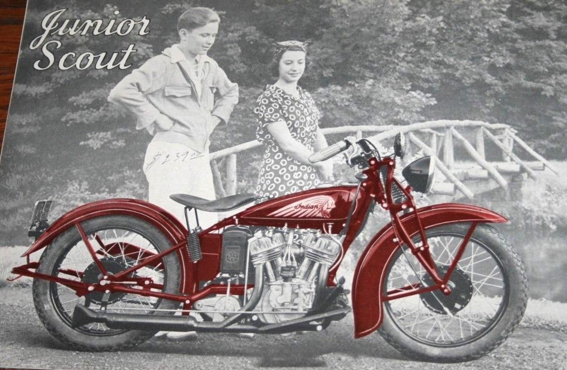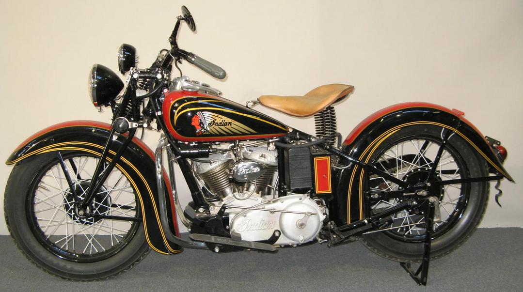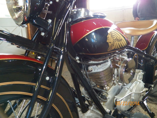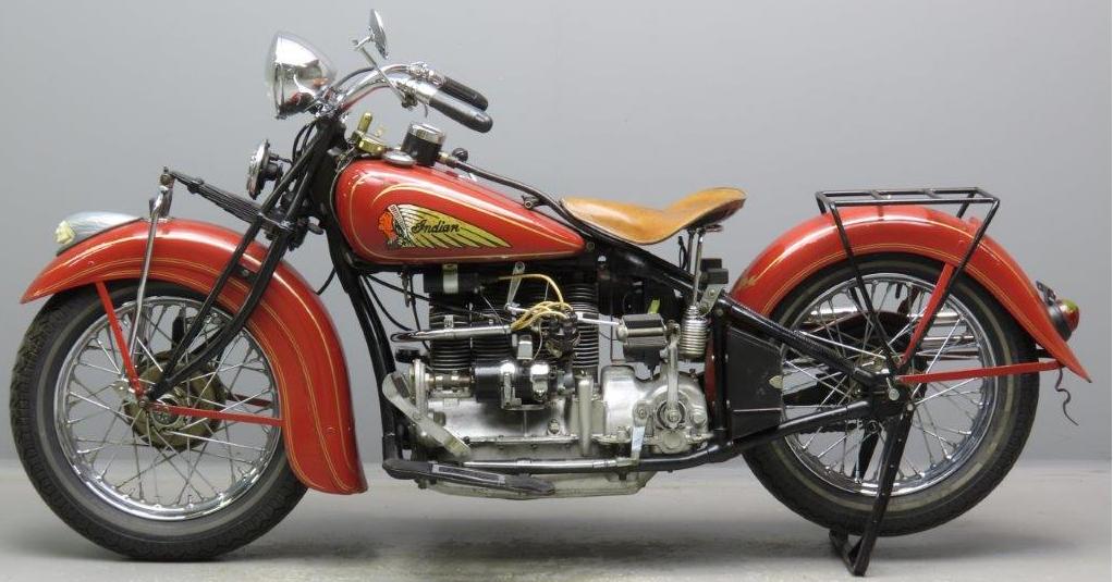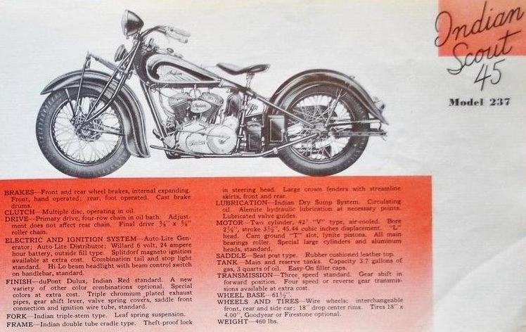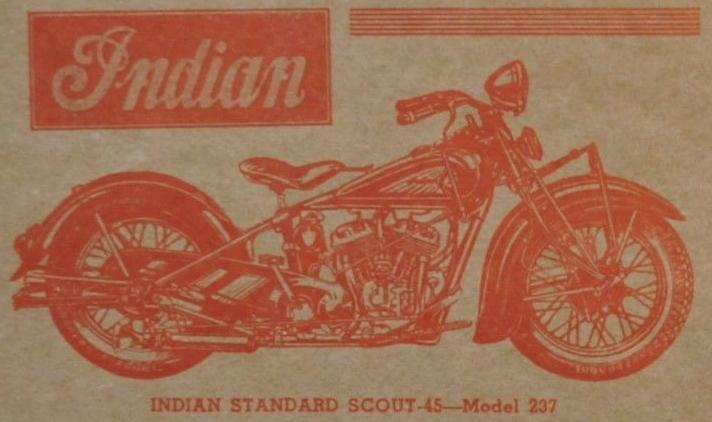 | 1937 | Indian red with gold striping | many others at extra charge | Junior Scout: Indian red only | Tank styles: | Standard tank panel | Arrow tank design | V-Top tank design | |||||