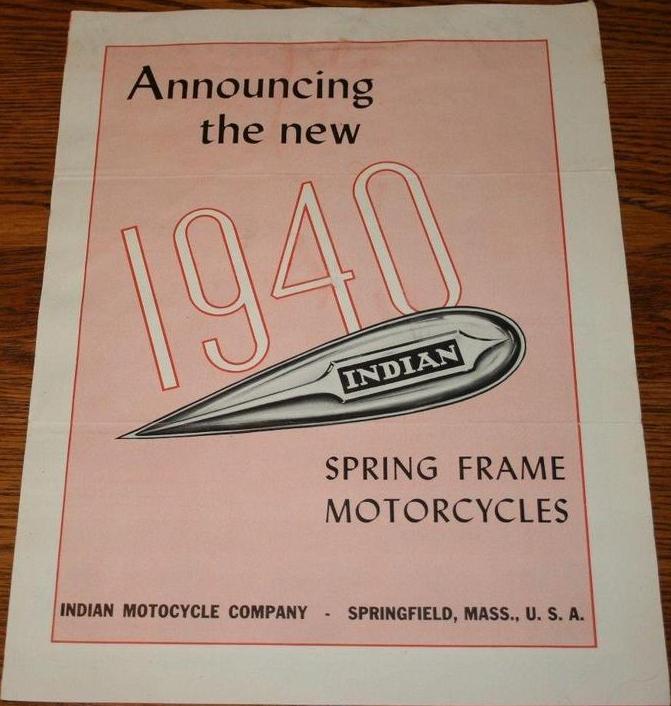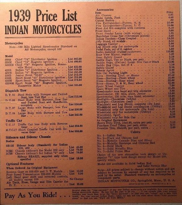 | 1939 339B Chief, distributor ignition, 385$ 339M Chief, magneto ignition, 400$ 339BM Chief "Bonneville" (high performance), magneto ignition, 425$ Standard Sidecar, ?$ Sport Sidecar, ?$ |