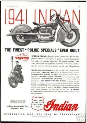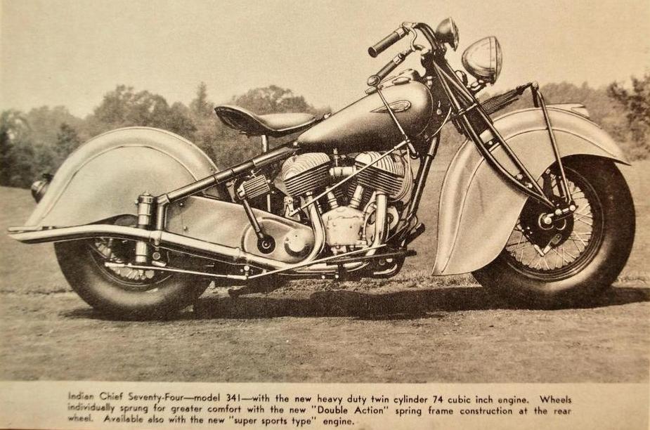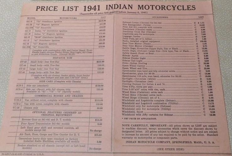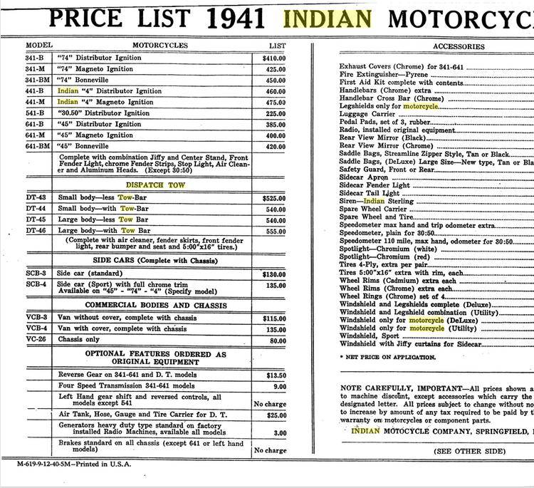 | 1941 341-B Chief, distributor ignition, 410$ 341-M Chief, magneto ignition, 425$ 341-BM Chief "Bonneville" (high performance), magneto ignition, 450$ 340-B (340CAV) Chief, military (105 built) Sidecar, ?$ |