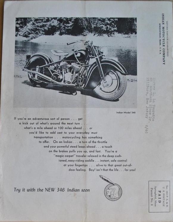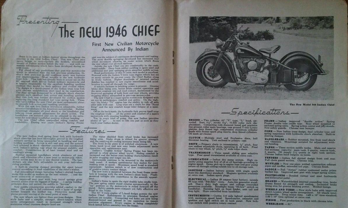 | 1945 345 Chief, distributor ignition (generally for police departments, similar to 340CAV, limited production) 346 pre-series with new front fork (July 1945) 346 pre-series with new front fork (September 1945) 346 pre-series with new front fork (September 1945) 346 pre-series with new front fork (November 1945) |