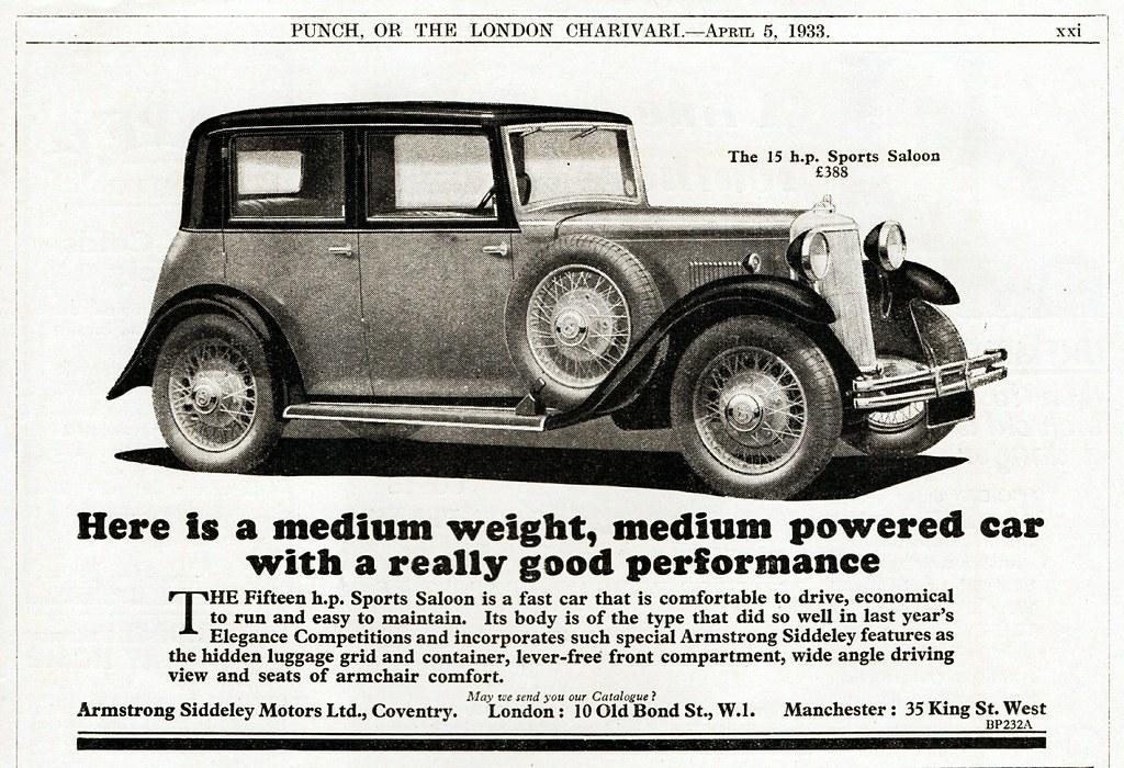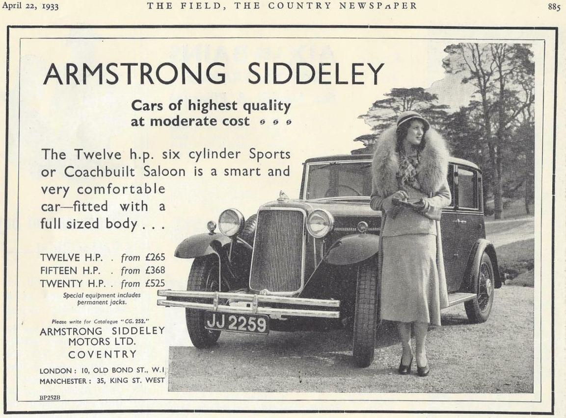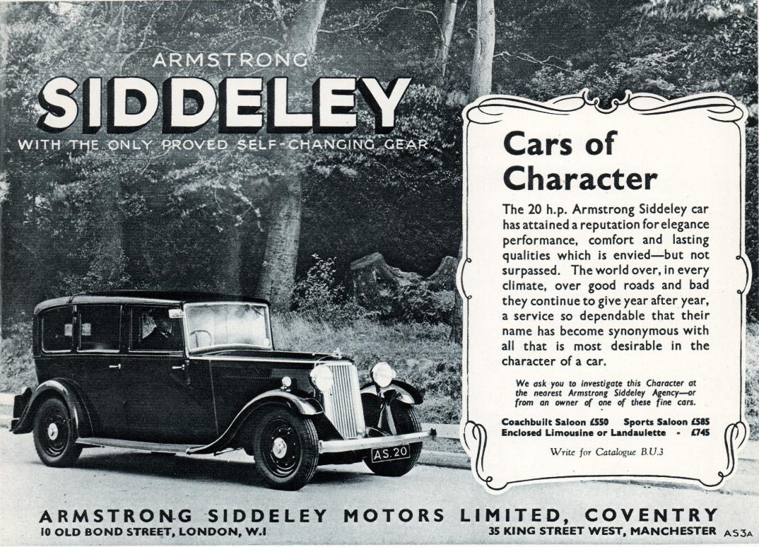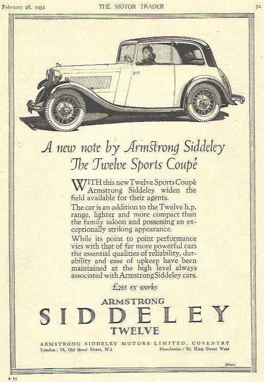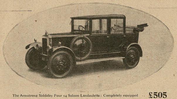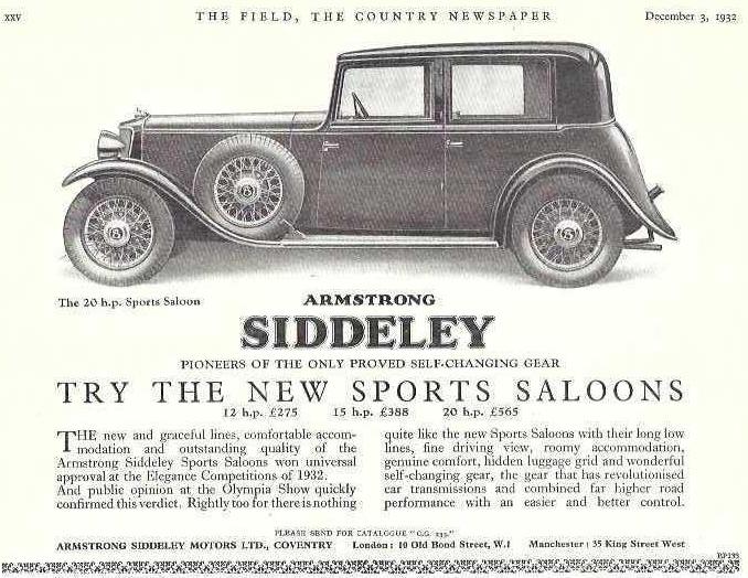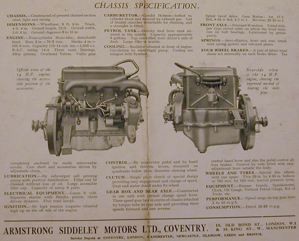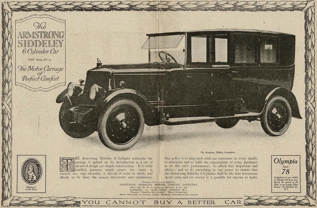 Армстронг Сиддли 18, (1921) 1922 - 1927, рядный 6-цил. OHV (2 блока по 3 цилиндра) - 2374 куб. см (69,342 мм x 41/8 дюйма (104,775 мм)) - ? л.с., 2500 штук (включая обычную модель 18) Вторая модель фирмы. Считалась моделью 1922 года, но впервые появилась в 1921-м. 6-просветный 4-дверный салон (saloon), - £725 (1925), £765 (1924), £895 (1922), 1926, 103кБ ландоле с закрытым передним рядом (enclosed landaulette), - £820 (1925), £860 (1924), £975 (1922), 1926, 164кБ 4-дверный турер (tourer), - £595 (1925), £670 (1924), £795 (1922), 1926, 96кБ, 1922, 30кБ интегральный фургон (van) - 1926, 65кБ |