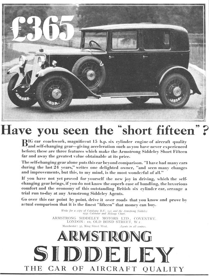 Армстронг Сиддли 15, X 1927 - 1934, 7203 штук, X 1927 - XI 1932: рядный 6-цил. SV - 1931 куб. см (63,5 (21/2 дюйма) x 101,6 мм (4 дюйма)) - ? л.с. XI 1932 - 1934: рядный 6-цил. SV - 2166 куб. см (63,6 (25/8 дюйма) x 114 мм) - ? л.с. С VII 1929 бак перемещён в заднюю часть шасси. С X 1930 V-образный радиатор утюгом вместо плоского, как у старших моделей. В ноябре 1932 - новый двигатель, 2169 куб. см вместо старого 1928 куб. см, аккумулятор перемещён с крыла под заднее сиденье, на боках капота - вертикальные лувры. два размера колёсной базы шасси - короткая, short wheelbase, swb - 9 футов 1 дюйм (2769 мм), длинная (с 1929 года), long wheelbase, lwb - 9 футов 7 дюймов (2921 мм) 6-просветный 4-дверный 4/5-местный коачбилт салон (6-light coachbuilt saloon, lwb) - £465 (1933), £415 (1932), £425 (1931), £410 (X 1929), £395 (22 V 1929), 1933, 235кБ, 1933, вид сзади, 135кБ, 1932, съёмка 1937, 40кБ, 1930, 205кБ, 1930, вид сзади, 265кБ, 1929, 222кБ, 1929, вид сзади, 240кБ, 1928, 92кБ, 1928, вид сзади, 80кБ 4-просветный 5-местный спортс салон, с 1932 года (sports saloon, lwb) - £388 (1933), £465 (1932, с люком), 1933, 43кБ, 1933, 157кБ 4-дверный турер (tourer, lwb) - £395 (1932, 1931), £350 (1929), 1928, 98кБ 4-просветный полу-панельный салон, 1931-1932 (semi-panelled saloon, swb) - £355 (1932), £365 (1931), 1931, 123кБ 2-просветное 2-местное открытое купе (folding head coupe, swb) - £450 (1932), 1930, 137кБ, 1930, 28кБ, 1930, вид сзади, 25кБ |