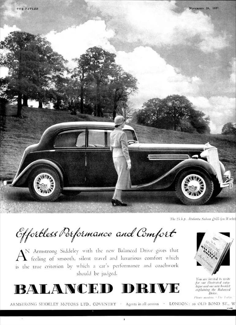 Армстронг Сиддли 25, 1937 - 1940, рядный 6-цил. OHV - 3670 куб. см (82,5 x 114 мм) - 85 л.с., 884 штуки (включая модель 20/25) главное отличие 25 от предшественника 20/25 - мотор с коробкой передач в одном блоке. Внешнее отличие - горизонтальная хромированная стрела-лувр вместо вертикальных лувров. два размера колёсной базы шасси - короткая, short wheelbase, swb - 10 футов 3 дюйма (3124 мм) и длинная, long wheelbase, lwb - 10 футов 11 дюймов (3327 мм) 4-просветный 4-дверный Аталанта салон (Atalanta saloon) - £585 (1938), £625 (1937), 1937, 146кБ 6-просветный 5-местный коач салон (coach saloon, lwb) - £575 (1938, 1937), 1937, 50кБ 6-просветный 5-местный таун и кантри салон, с перегородкой (town & country saloon, lwb) - £595 (1938, 1937), 1937, 56кБ 6-просветный 7-местный лимузин (limousine, lwb) - £745 (1938, 1937), 1937, 54кБ |
