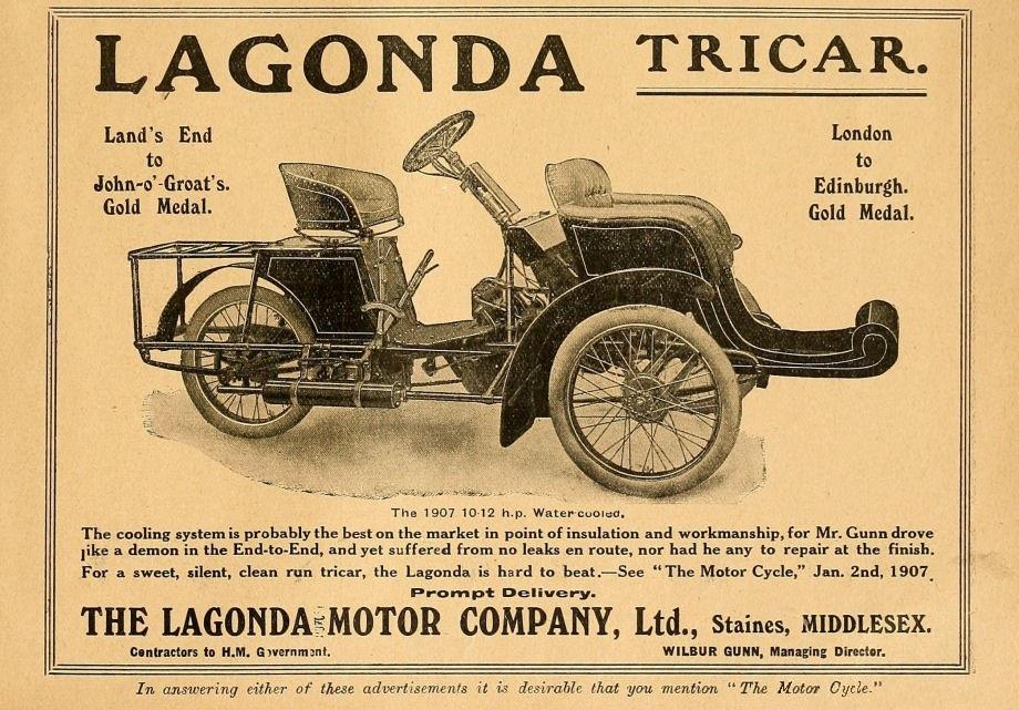 Лагонда-Трикар, 1903-1908, 69 штук 10/12 hp, 1905-1908, V2-цил. IOE - 1221,5 куб. см (90 x 96 мм) - 12 л.с., с 1906 автомобильный руль взамен мотоциклетного. 1907, 146кБ, 1906, 174кБ, 1905, 138кБ, 1904 (??? - должен быть 1-цилиндровым в 1904!), 175кБ, 1904 (???), 210кБ. 1903-1905, 1-цил. - ? куб. см (? x ? мм) - 5 л.с. 1904, 53кБ. |