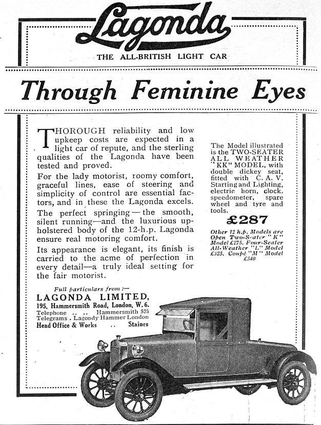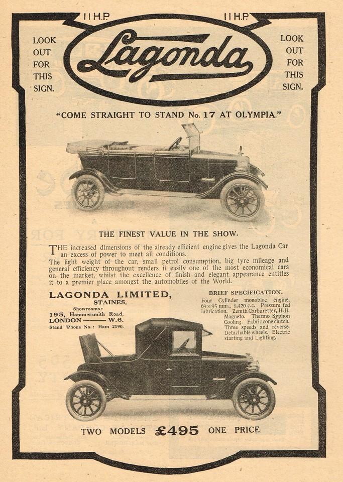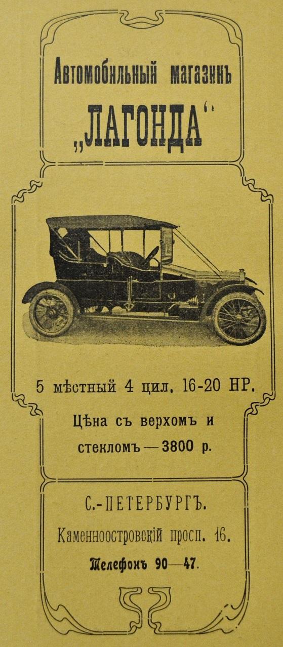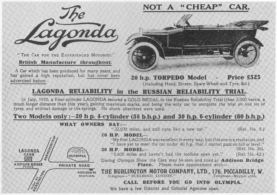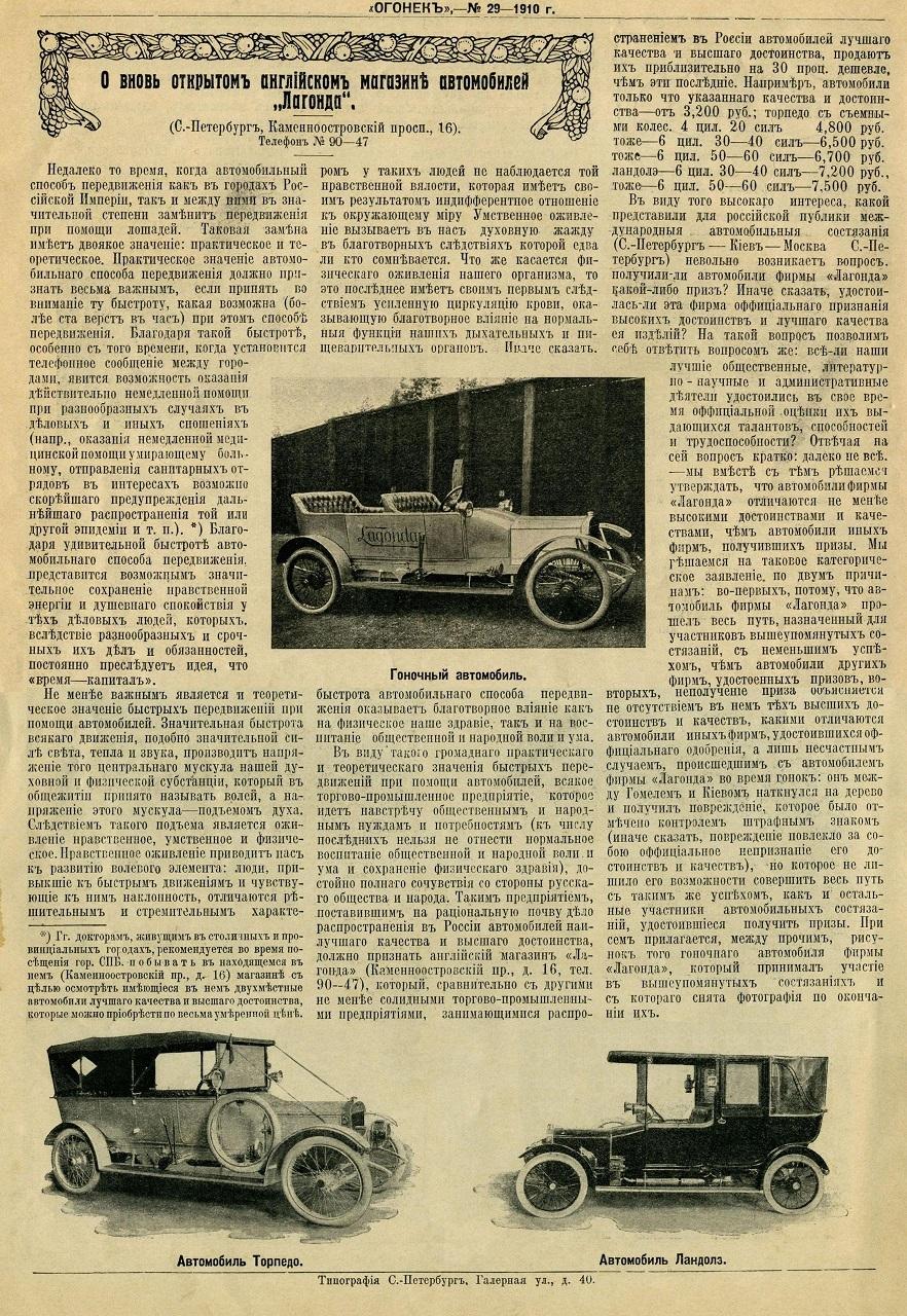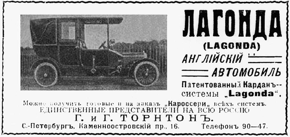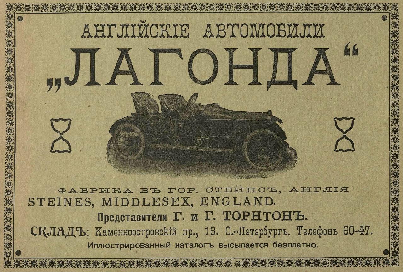1910-1911 - автомобили "русского" периода фирмы, когда почти все Лагонды шли на русский рынок. Все русские фотографии и реклама ниже относятся к этому периоду. Лагонда 30 hp, 1909-1911-?, рядный 6-цил. IOE - ? куб. см - 80 л.с.. Лагонда 50 hp, 1909-1911-?, рядный 6-цил. IOE - ? куб. см - ? л.с.. Лагонда 16-20 hp, 1909-1911-?, рядный 4-цил. IOE - ? куб. см - 58 л.с.. торпедо - 117кБ, 1913, 221кБ - это ложь, ни золотой медали, ни чугунной Лагонда не завоевала, она была снята с пробега за аварию с деревом между Гомелем и Киевом, но продолжила путь вне конкурса. эти торпедо и ландолэ предположительно тоже 16-20 hp - 116кБ, 368кБ, 97кБ, 105кБ. думаю, что и это тоже 16-20 hp - 273кБ. Лагонда 12-18 hp, 1910-1911-?, рядный 4-цил. IOE - ? куб. см - ? л.с.. торпедо основателя Лагонды Уилбура Гунна (Wilbur Gunn) в пробеге 1910 года Петербург - Киев - Москва - Петербург: Петербург, 222кБ, Царское Село, 148кБ, Москва, Манеж, на переднем плане - Бенц, 186кБ. Лагонда 16-18 hp, 1909. Лагонда 14-16 hp, 1908. Лагонда 10-12 hp, 1908. |