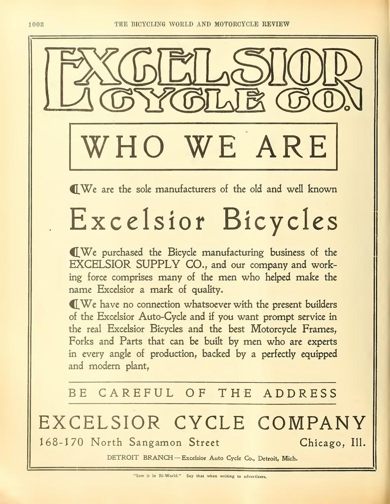 Excelsior Cycle Co. was not connected with Excelsior Motor Manufacturing & Supply Co., - Excelsior motorcycles producer, although both companies were based in Chicago.