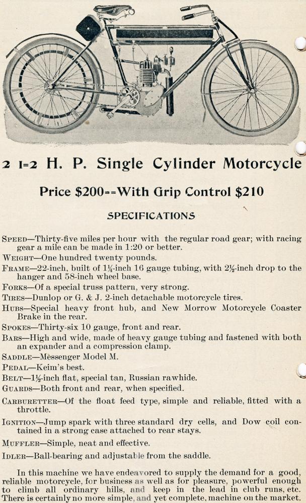 (347.5cc), bore 3", stroke 3", 1-speed, 2.5hp/2000rpm, battery ignition, belt drive, 40 mph, $180 ($210 tandem version), 147k photo,