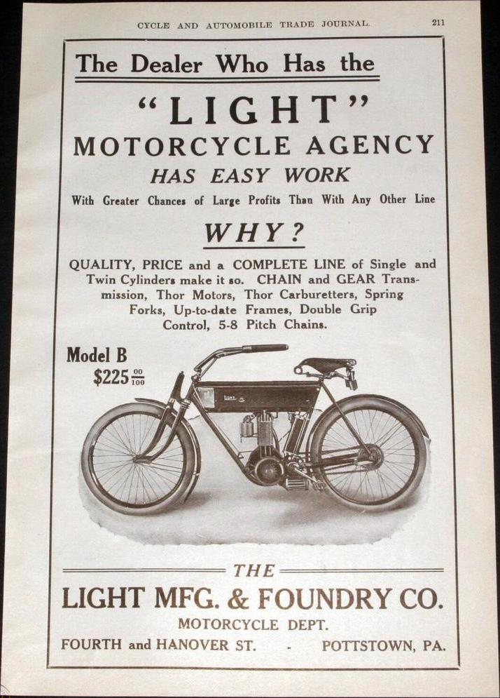 1909 Light Model B, Thor 1-cyl. F-head, 3hp, 19,30 cu. in. (316,3cc), battery ignition, 1-speed, chain with gear drive, ? mph, $?, 7k poster.