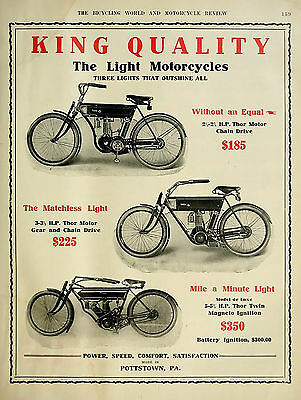 1908 Light Model B, 3hp, Thor 1-cyl. F-head, 3hp, 19,30 cu. in. (316,3cc), battery ignition, 1-speed, gear and chain drive, ? mph, $225, 47k poster, 113k poster, 49k 1907 pre-series.
