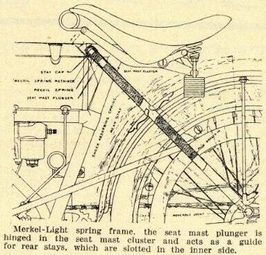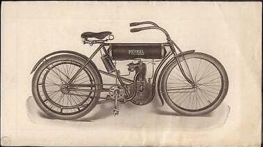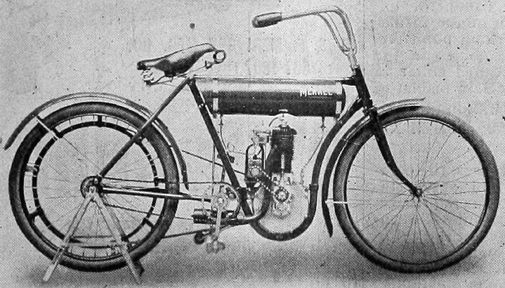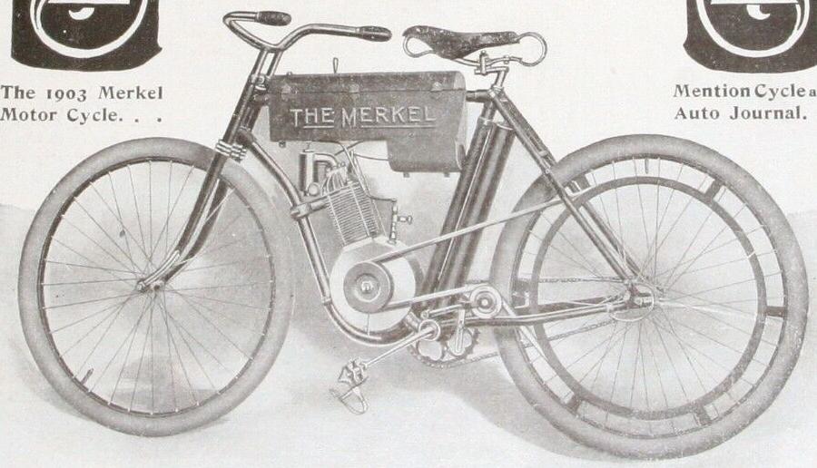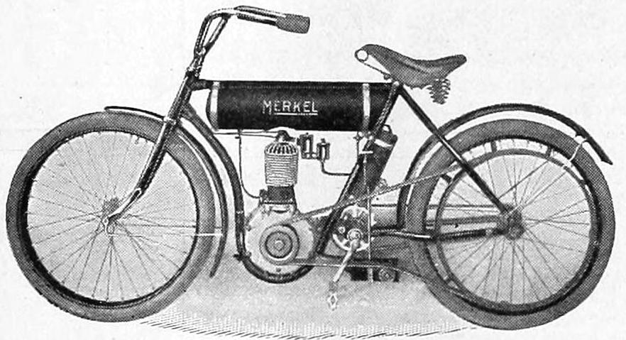 1907 The Merkel 3hp, 1-cyl. F-head, 24.89 cu. in. (407.8cc), bore 31/4", stroke 3", battery ignition, 1-speed, flat belt drive, 5...50 mph, $185, 75k photo, 119k poster, 55k poster (rigid fork, old battery).