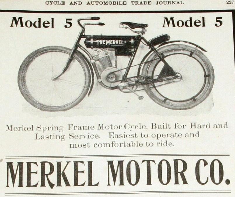 1905 The Merkel Model 5, 1-cyl. F-head, 21/4hp, 14.21 cu. in. (232.8cc), bore 25/8", stroke 25/8", battery ignition, 1-speed, flat belt drive, ? mph, $150 rigid frame, $155 spring frame, 87k poster.