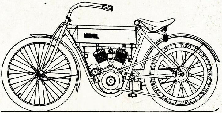 1907 (vertical cylinder, spring frame only, spring fork - $15 extra, separate exhaust pipe going forward-down-back, battery under the seatpost tube, full-length front mudgard on rigid fork models)