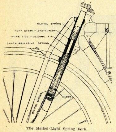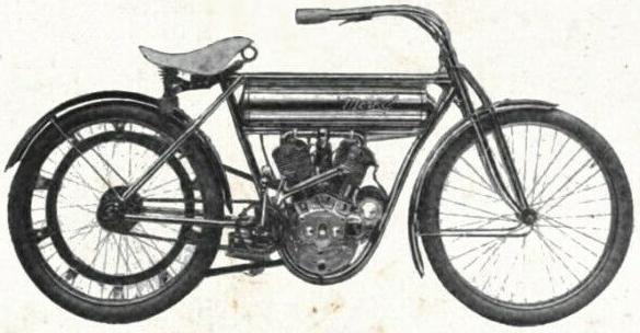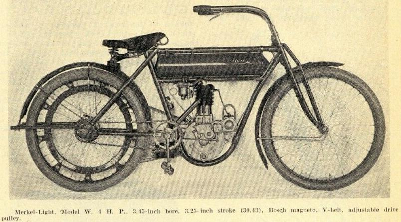 1909 (early 1909 models - vertikal "Merkel" on the tank, some time after 3 VIII 1909 the Merkel-Light Motor Co. in Pottstown continued old Merkel models with oblique "Merkel" on the tank. Spring frame and fork. Model U goes from 1908 with some 1909 improvements, models W and V are completely new and differ only by engines, which are interchangeable. Model V has longer handlebars than W. New frame (models V and W), new style tank, new spring fork (all non-Special models), new handle bar, color - New London Smoke Grey, optional - royal blue or black.)